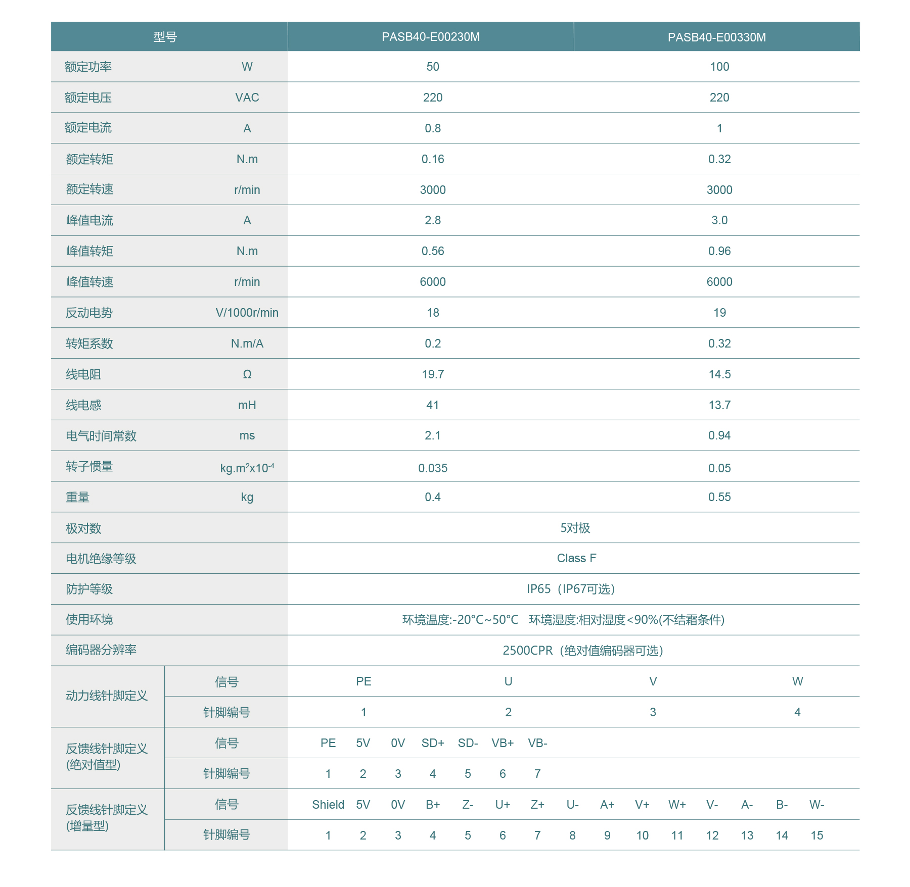 PASB40 High Inertia Series AC servo motors offer rated power of 50-100W, 0.16-0.32 Nm torque, and speeds up to 3000 rpm. Featuring 220V rated voltage, peak torque up to 0.96 Nm, Class F insulation, IP65 protection, and 23-bit absolute absolute encoder, ideal for precise, high-inertia industrial applications.