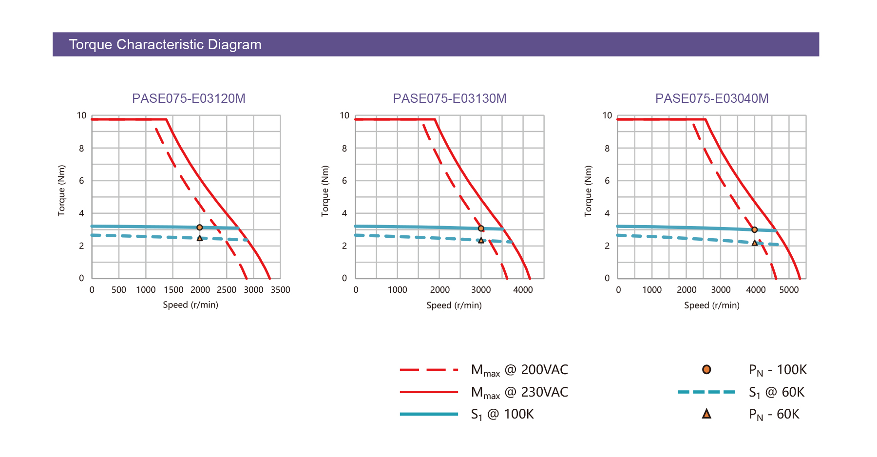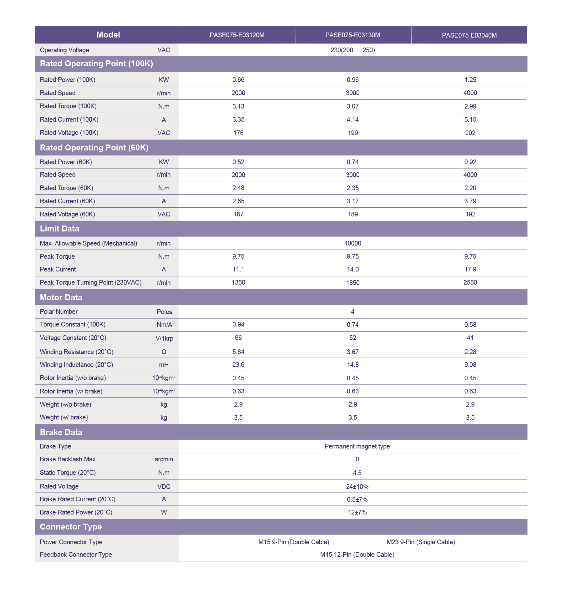 The PASE075 High Performance Series AC servo motor delivers 0.66–1.25 kW output with speeds from 2000 to 4000 rpm and torque up to 3.13 Nm. Featuring peak torque of 9.75 Nm, Class F insulation, and a robust 4-pole design, it ensures precision, reliability, and versatility for demanding motion control systems.