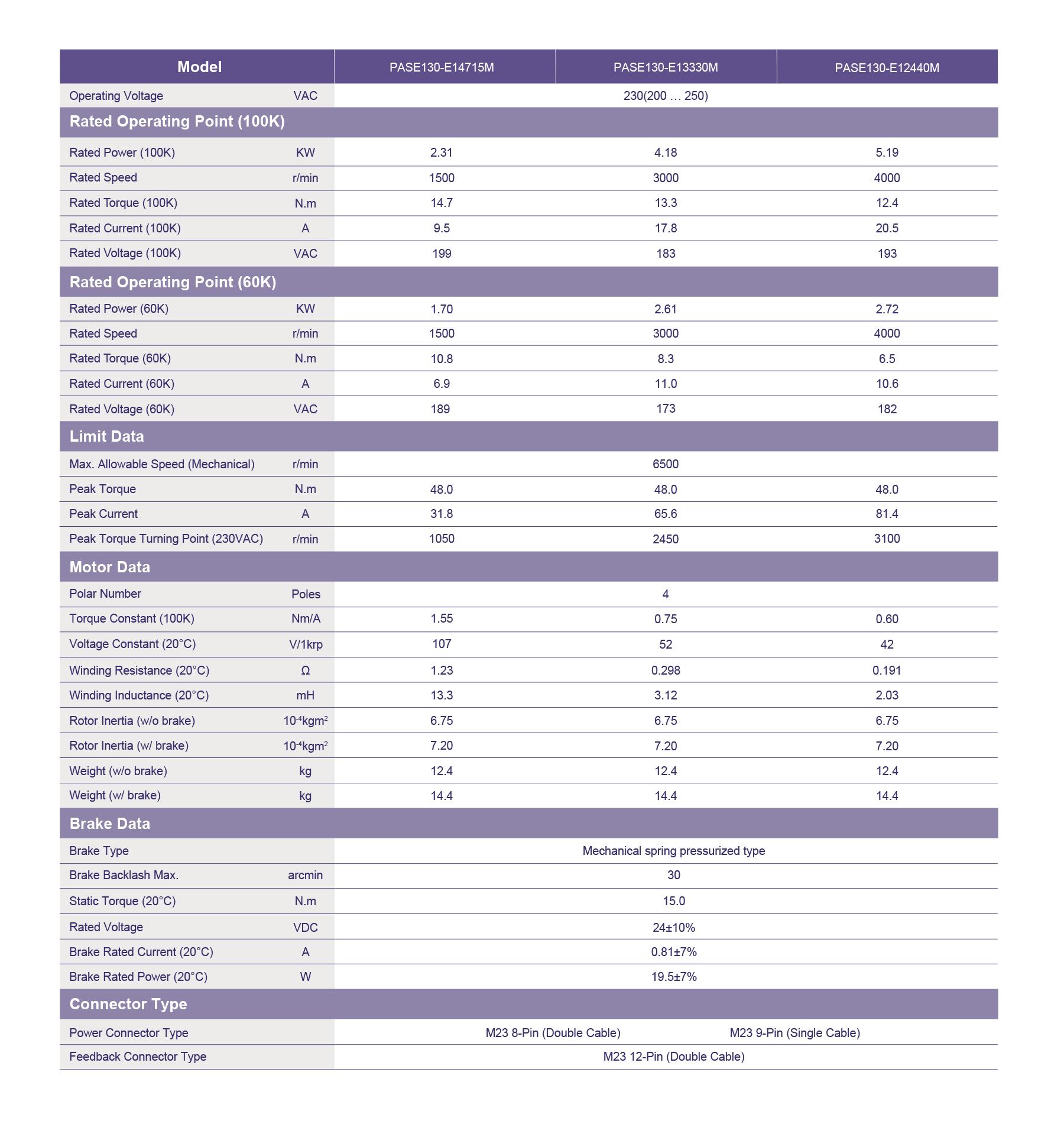 The PASE130 High Performance Series AC servo motor delivers 2.31–5.19 kW with torque up to 14.7 Nm and speeds to 4000 rpm. Offering peak torque of 48 Nm, 4-pole precision, and reliable brake options, it ensures high-efficiency, durable performance for demanding industrial motion control.