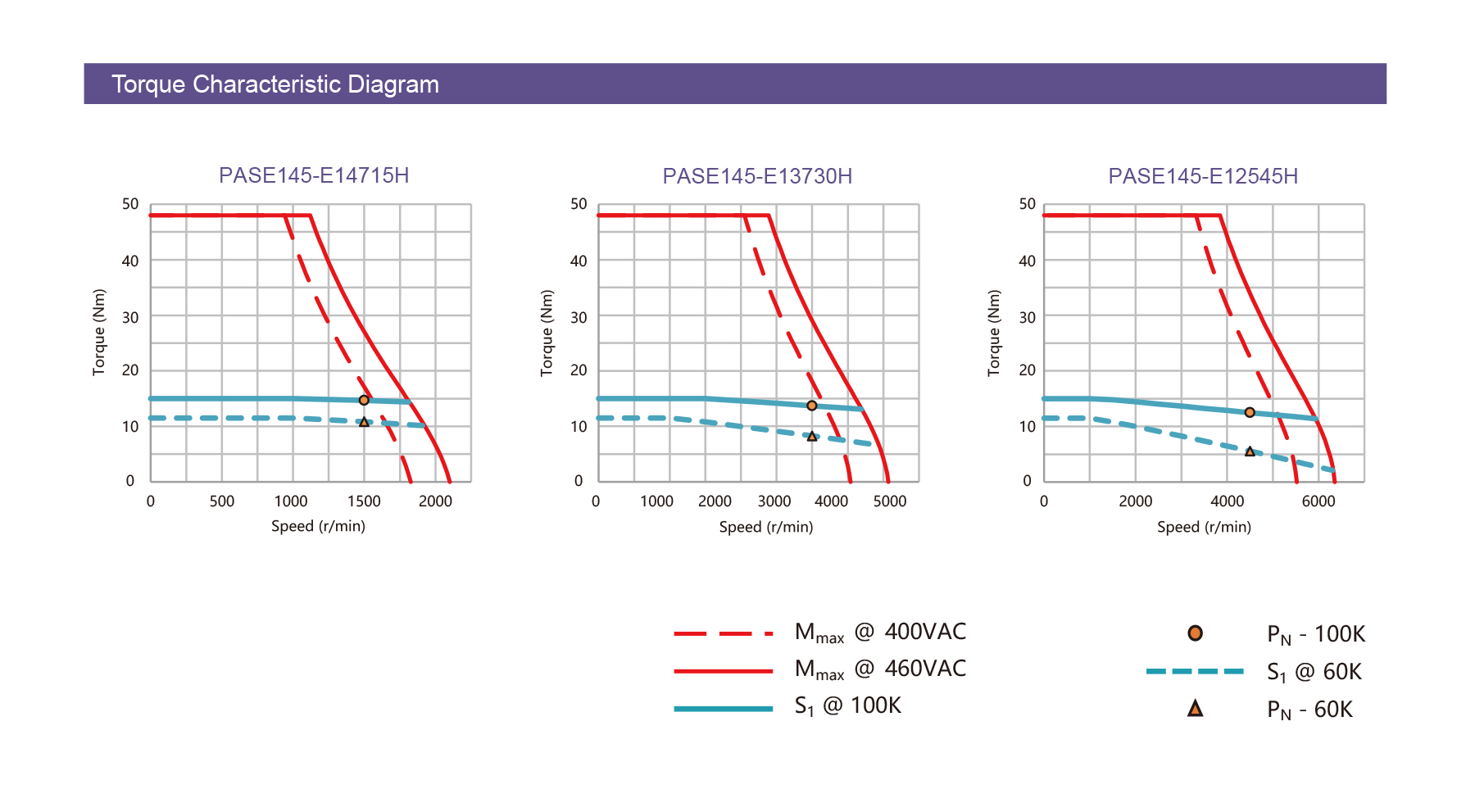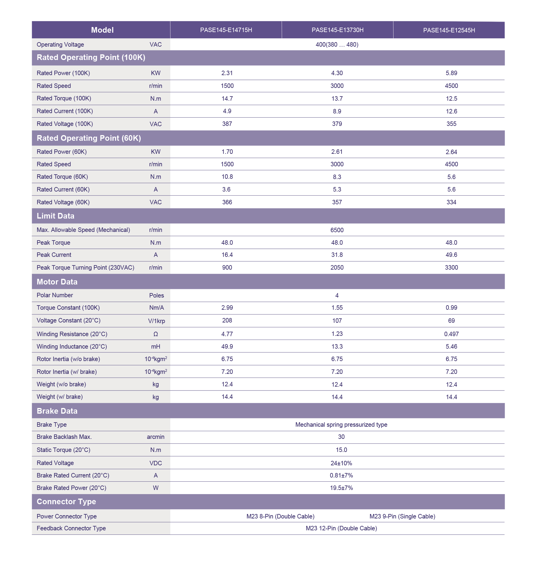 The PASE145 High Performance Series AC servo motor offers 2.31–5.89 kW at 400 VAC, speeds up to 4500 rpm, and torque up to 14.7 Nm. With 48 Nm peak torque, 4-pole precision, and robust brake options, it delivers high efficiency, durability, and power for demanding industrial automation needs.