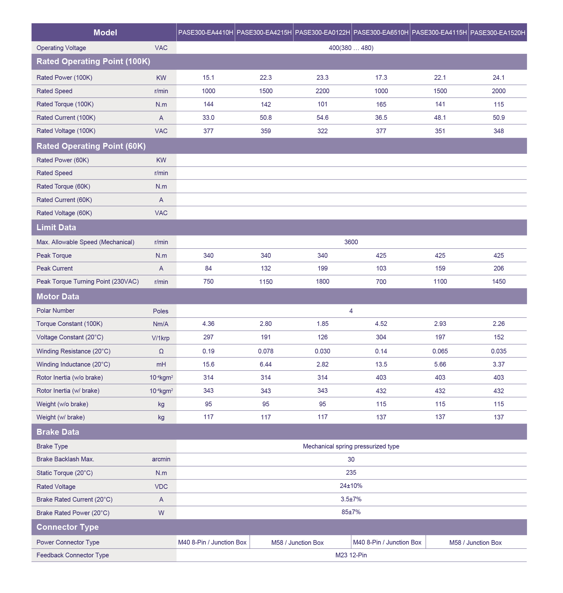 The PASE300 High Performance Series AC servo motor offers robust AC servo motors ranging from 15.1 to 24.1kW with rated speeds of 1000 to 2200 rpm and torque up to 165Nm. Featuring 400VAC operation, mechanical spring-pressurized brakes, and advanced connectors, these motors deliver reliable precision control for demanding industrial applications.