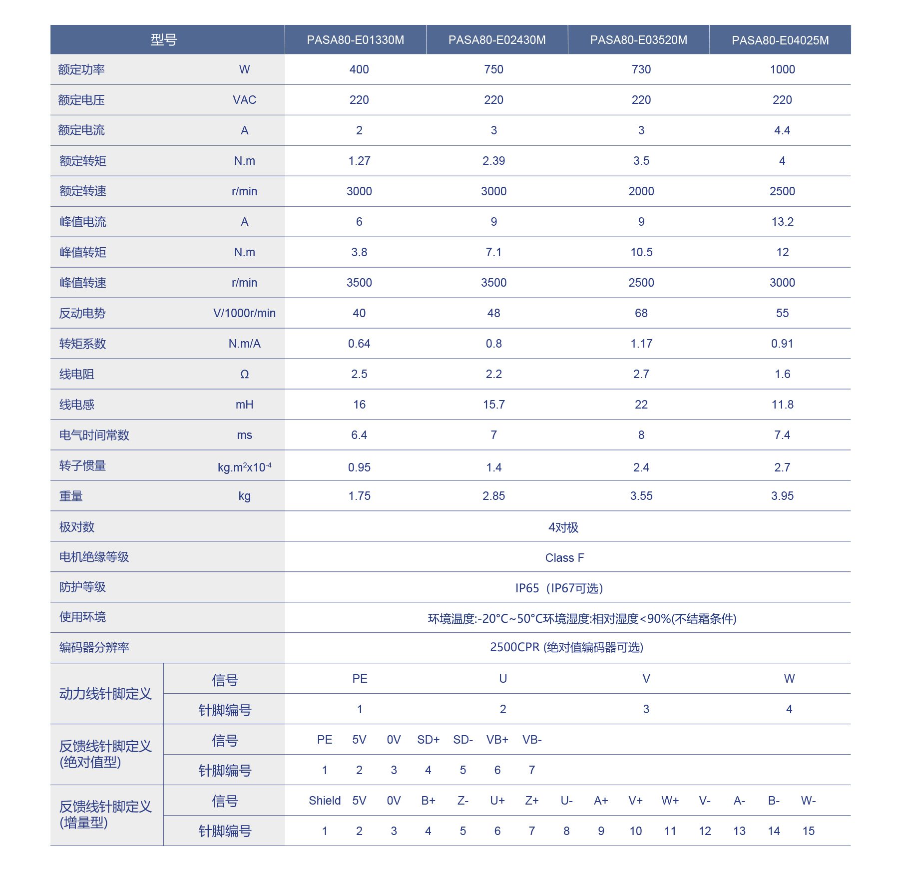 PASA80 Universal Series AC servo motors offer 400-1000W power at 220V with speeds up to 3500rpm. Featuring IP65 protection (IP67 optional) and Class F insulation, they operate reliably in -20 to +50°C environments. With high torque output and optional 23-bit absolute encoder, ideal for automation, robotics, and precision control applications.