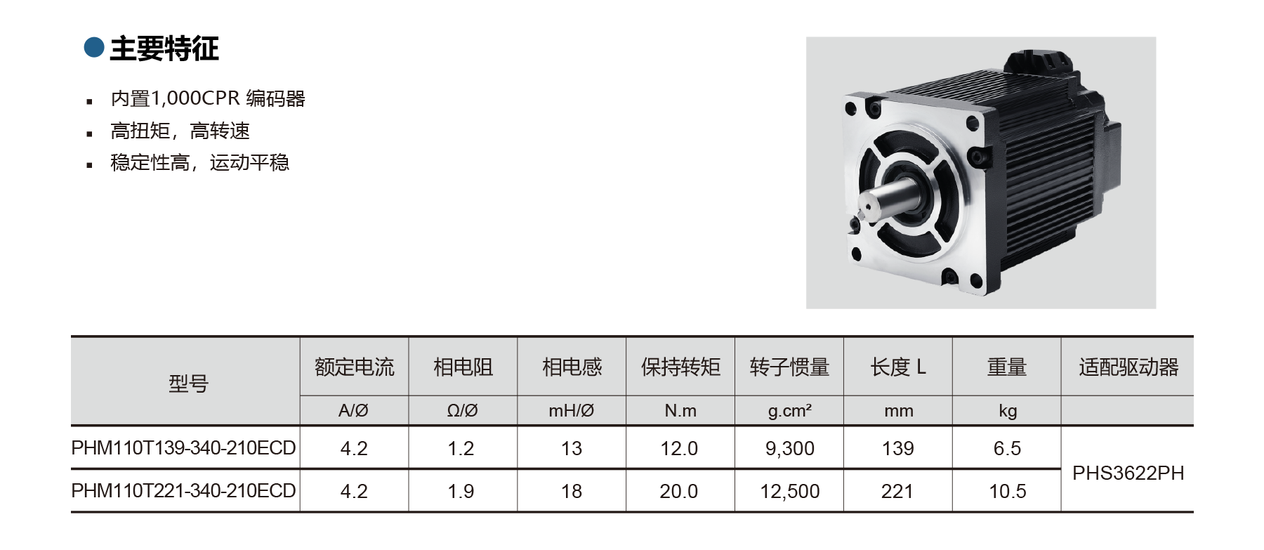 The PHM110T Series closed-loop stepper motors feature built-in 1,000 CPR optical encoders, offering high torque, high speed, and stable, smooth motion. Models like PHM110T139-340-210ECD and PHM110T221-340-210ECD deliver strong holding torque and precise control, ideal for CNC machines, and industrial automation.