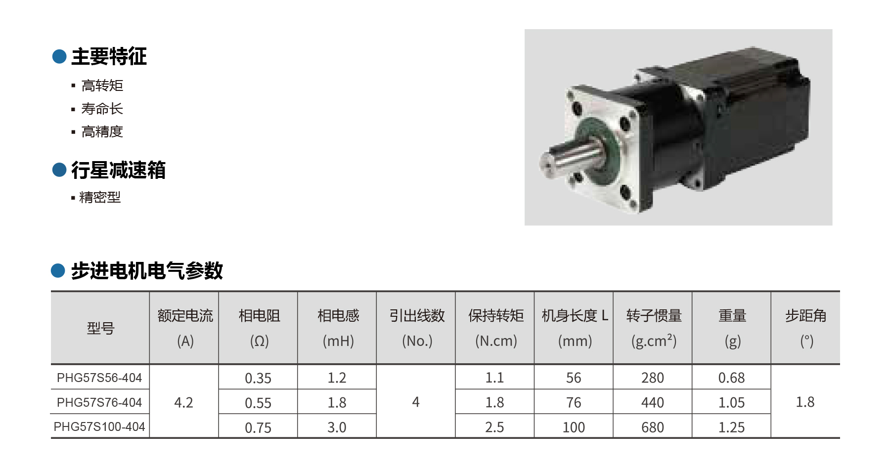 The PHG57S Series NEMA 23 stepper gear motors offer high torque, long life, and precision performance with integrated planetary gearboxes. Featuring a 1.8° step angle, low backlash (≤25 arcmin), and quiet operation (≤60 dB), these motors provide smooth, reliable motion. With staged gear ratios, rated admissible torque ranges from 25 N·m to 40 N·m and efficiency up to 95%, making them ideal for automation, CNC, and precise motion control applications requiring compact, high-performance stepper gear motors.