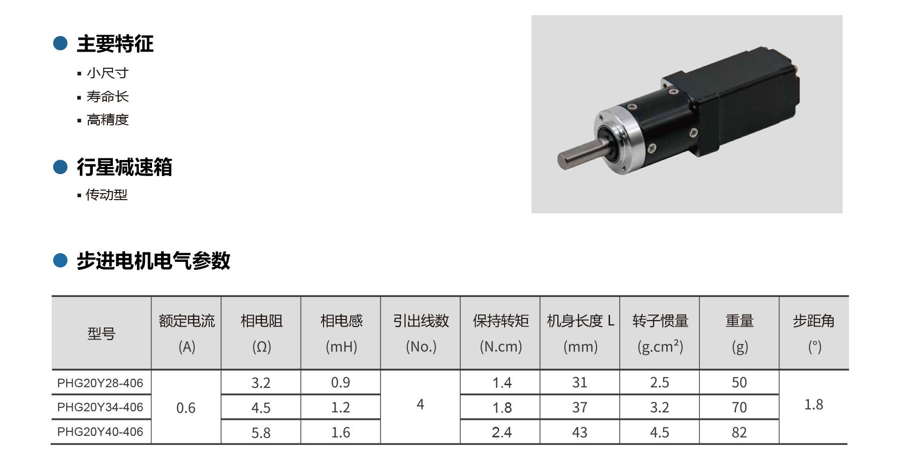 The PHG20Y Series NEMA 8 stepper gear motors combine high precision, long life, and compact design with planetary gearboxes for torque multiplication. Featuring 1.8° step angle, low inertia, and smooth operation, these motors are available with 1–3 stage gear ratios, providing rated admissible torque from 0.3 N·m up to 2.5 N·m. With minimal backlash (≤60 arcmin), low noise (≤60 dB), and high efficiency (up to 90%), PHG20Y motors are ideal for miniature automation, and precision positioning systems requiring reliable performance in a compact footprint.