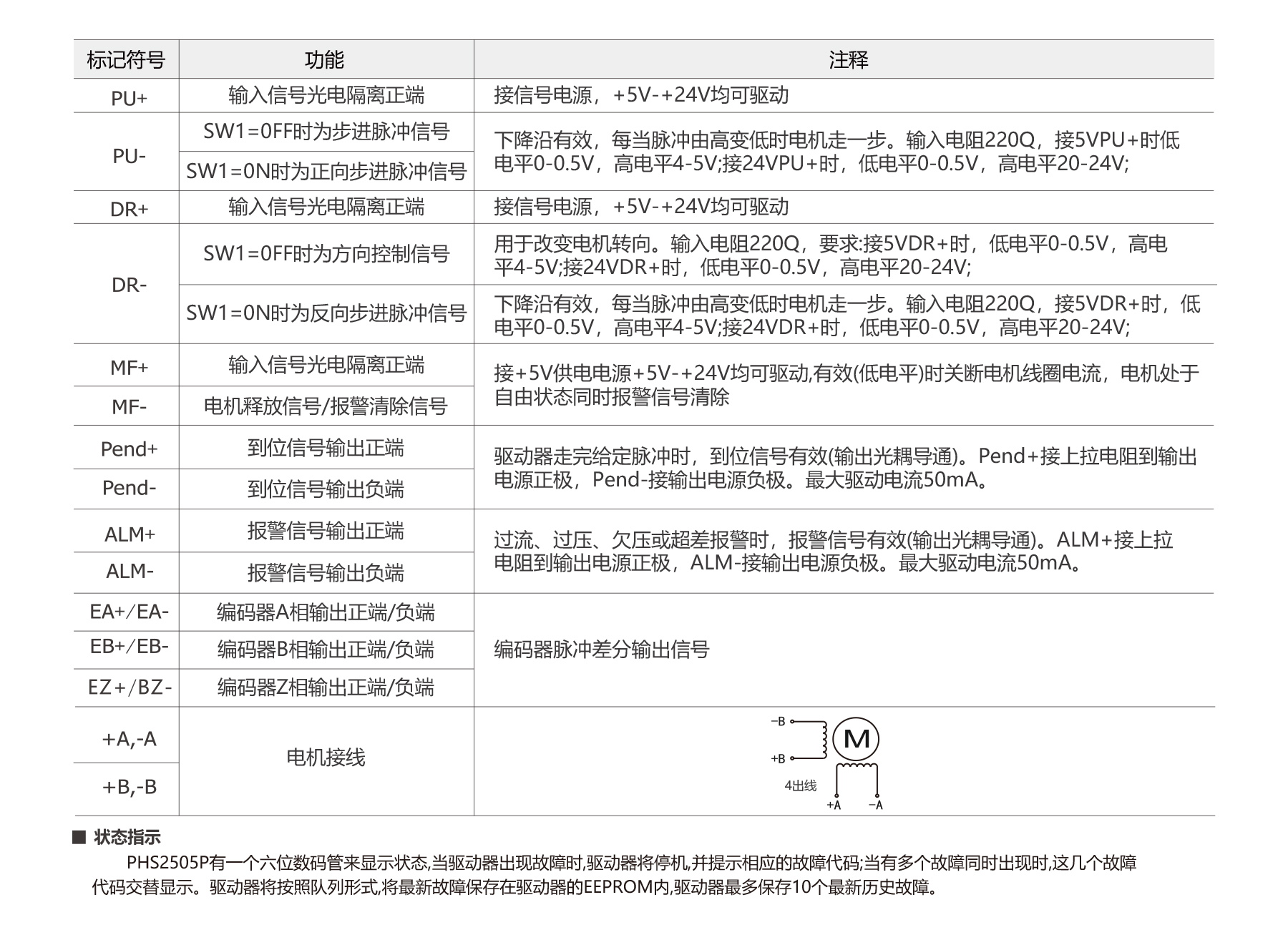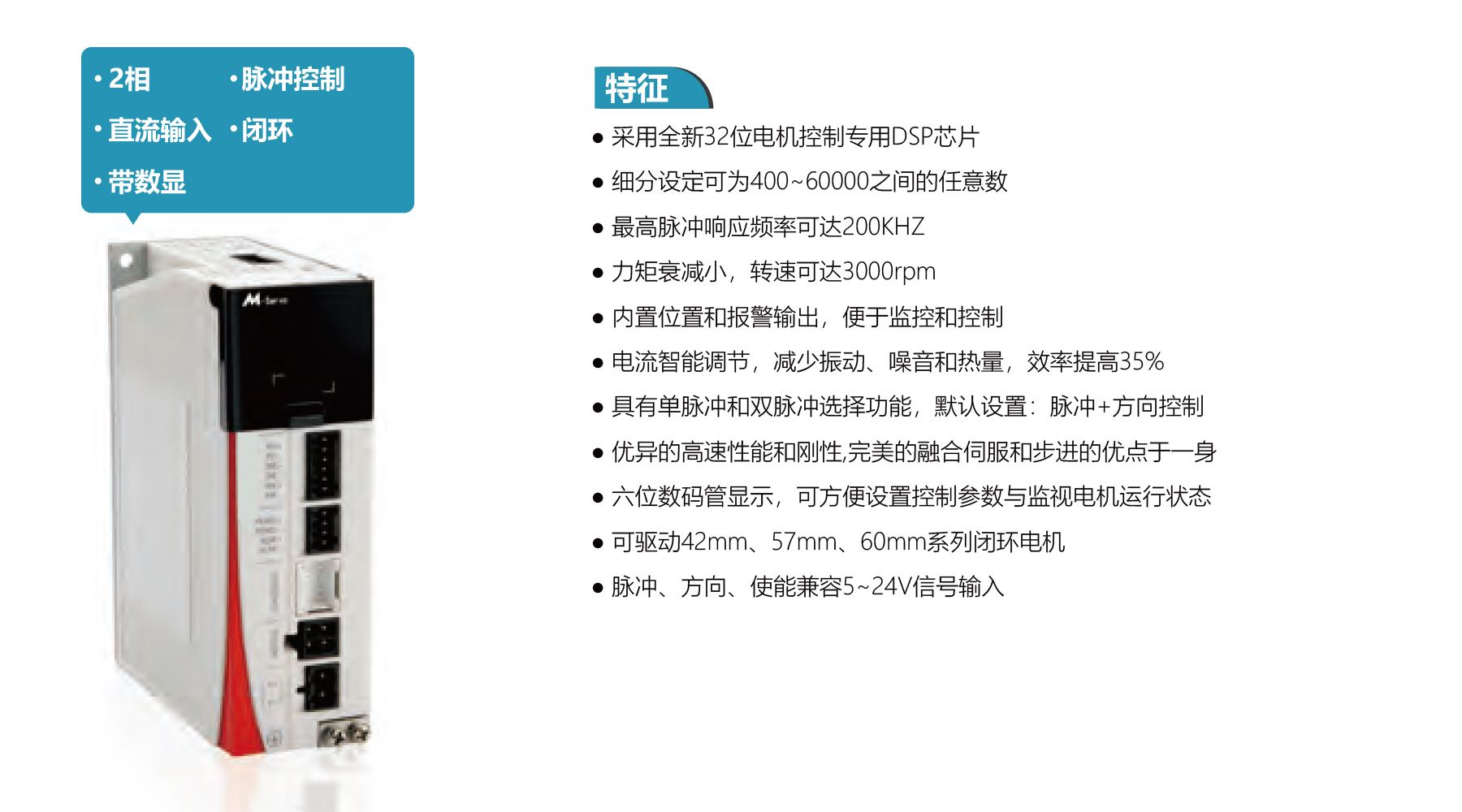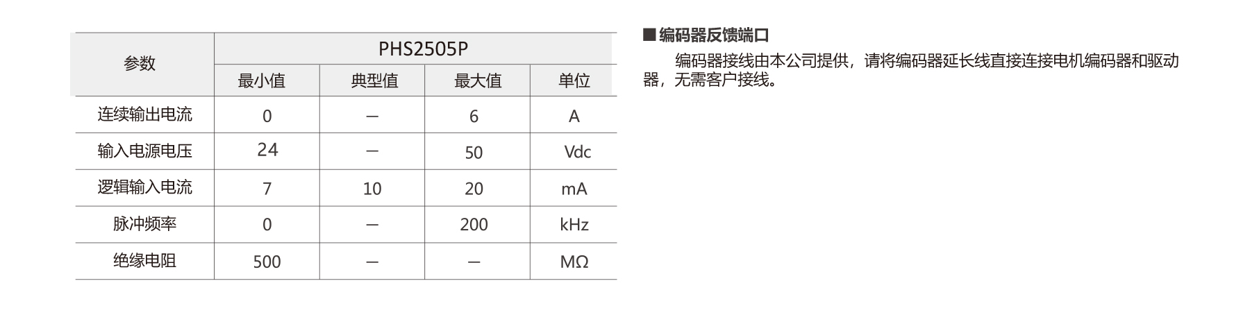 PHS2505P is a 2-phase closed-loop pulse control driver with a dedicated 32-bit DSP motor control chip and LED digital display. It supports DC24–50 V input, microsteps from 400–60,000, and a max pulse response of 200 kHz. Features include low torque attenuation, speeds up to 3000 rpm, built-in position and alarm outputs, intelligent current adjustment, and pulse/direction/enable inputs (5–24 V). Compact: 120×90×40 mm, 0.65 kg, suitable for 42–60 mm (NEMA17–24) closed-loop stepper motors.