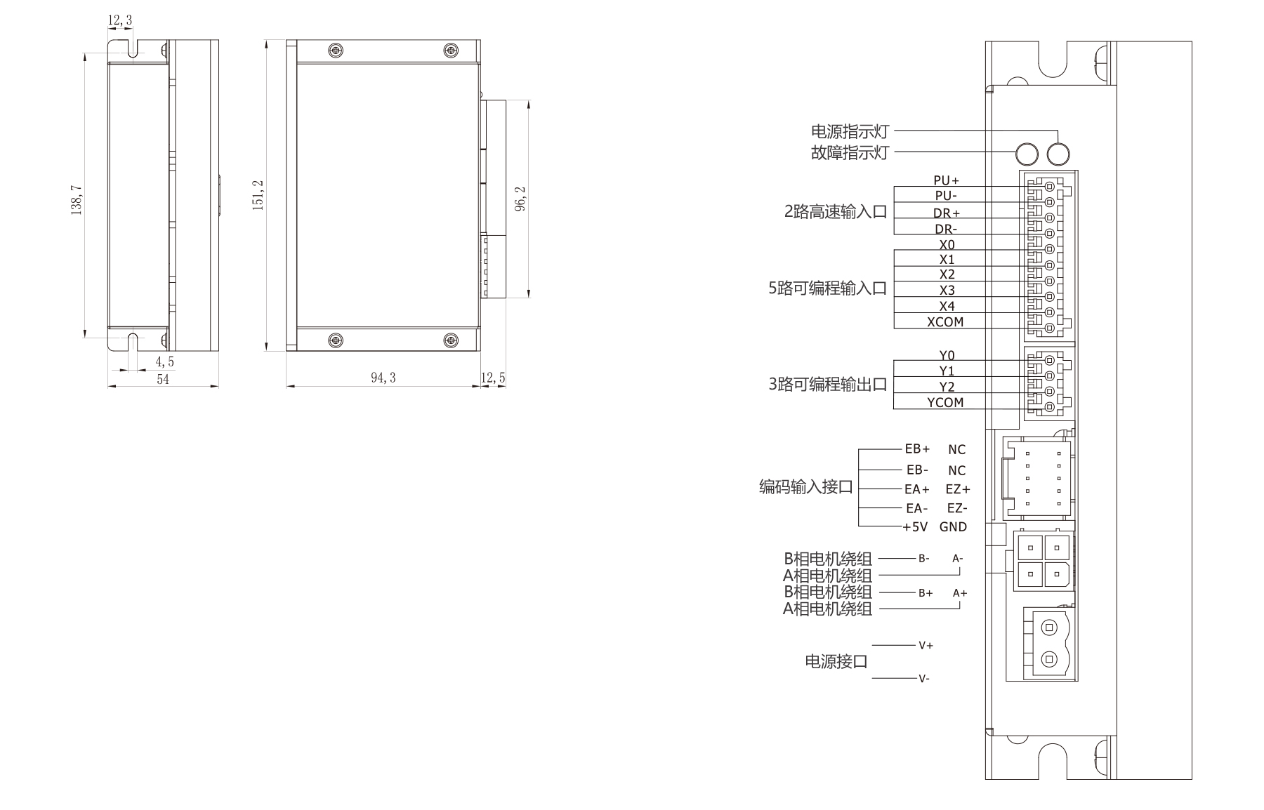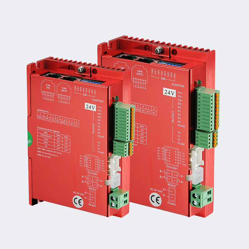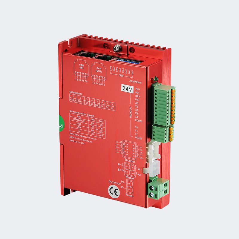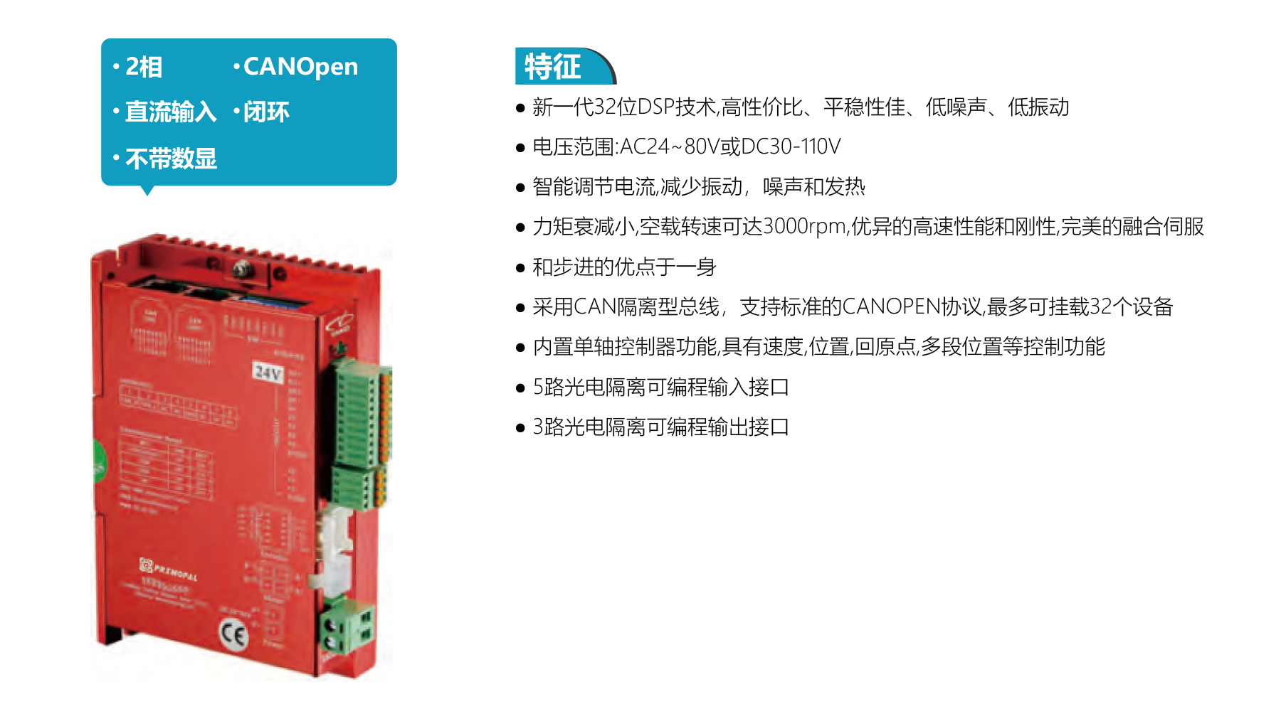 PSD2608CH is a 2-phase CANOpen closed-loop stepper driver with AC input, powered by a dedicated 32-bit DSP motor control chip. It supports 16 microstep settings and intelligent current adjustment to reduce vibration, noise, and heat, ensuring low torque attenuation with speeds up to 3000 rpm. The driver combines high-speed performance and rigidity, leveraging both servo and stepper advantages. It supports up to 32 devices via an isolated CAN bus and features a built-in single-axis controller for speed, position, homing, and multi-segment position control. Connectivity includes 5 optically isolated input channels and 3 optically isolated output channels. Voltage range: AC 24–80 V / DC 30–110 V.