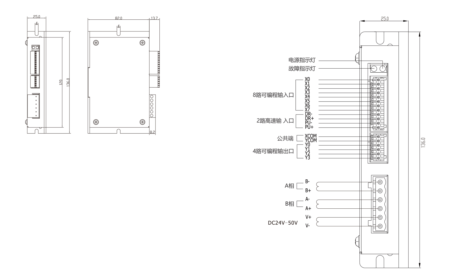 PSH2405C is a 2-phase CANOpen open-loop driver with 32-bit DSP technology, offering low noise and vibration. It supports position, speed, and multi-segment position control via standard MODBUS-RTU over RS-485. Features include 4 optically isolated inputs, 2 outputs, smooth current control with adjustable drive current up to 1.5 A, DC24–36 V input, and protection against over-voltage, under-voltage, and over-current. Up to 30 drives can be controlled simultaneously.