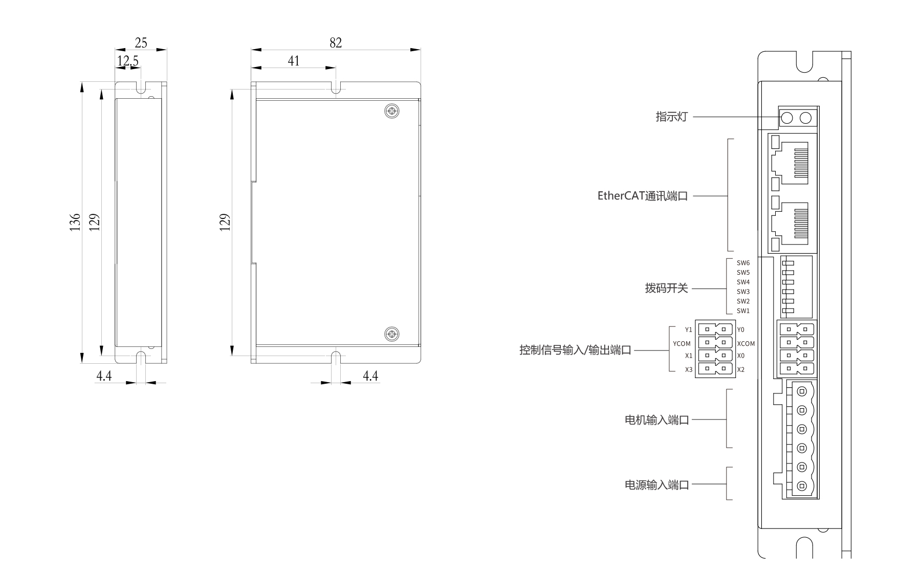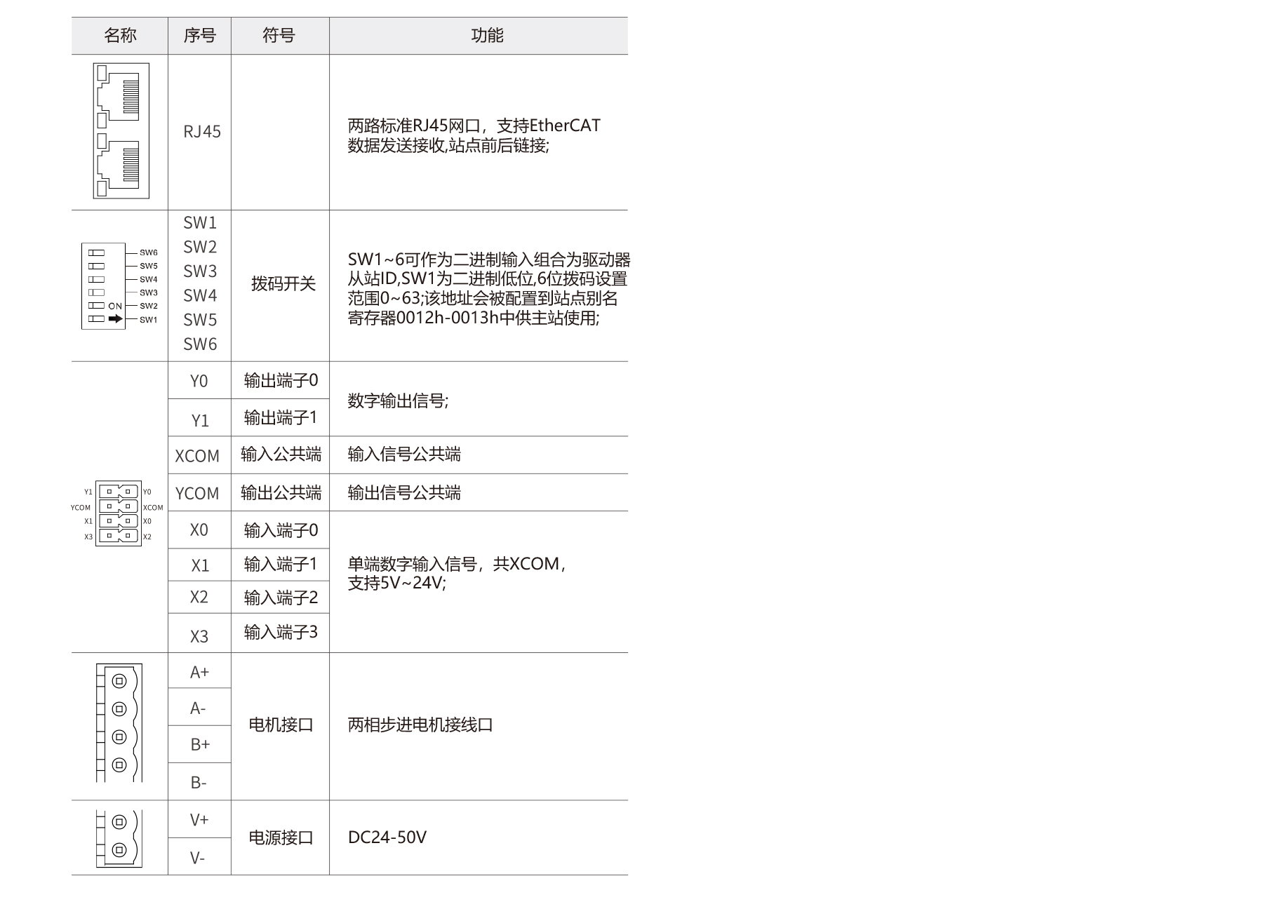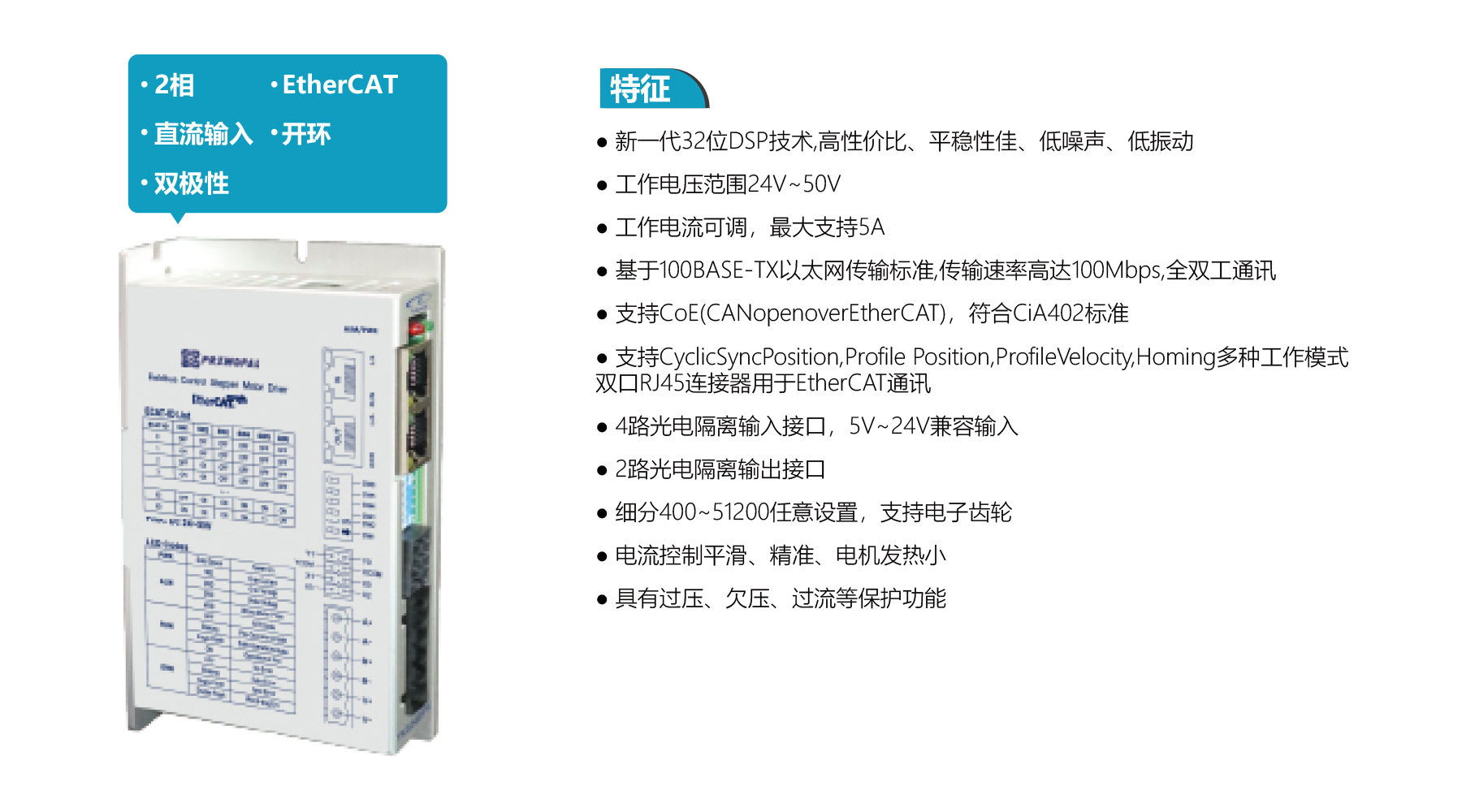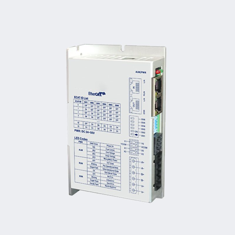 PSH2405E is a 2-phase EtherCAT open-loop driver featuring 32-bit DSP control for high stability, low noise, and minimal vibration. It supports DC24–50 V input with adjustable current up to 5 A. The driver offers CoE (CANopen over EtherCAT) compliance, multiple modes (Cyclic Sync Position, Profile Position/Velocity, Homing), dual RJ45 ports, 4 optically isolated inputs, 2 outputs, microstepping 400–51,200 with electronic gearing, precise current control, and over-voltage, under-voltage, and over-current protections.