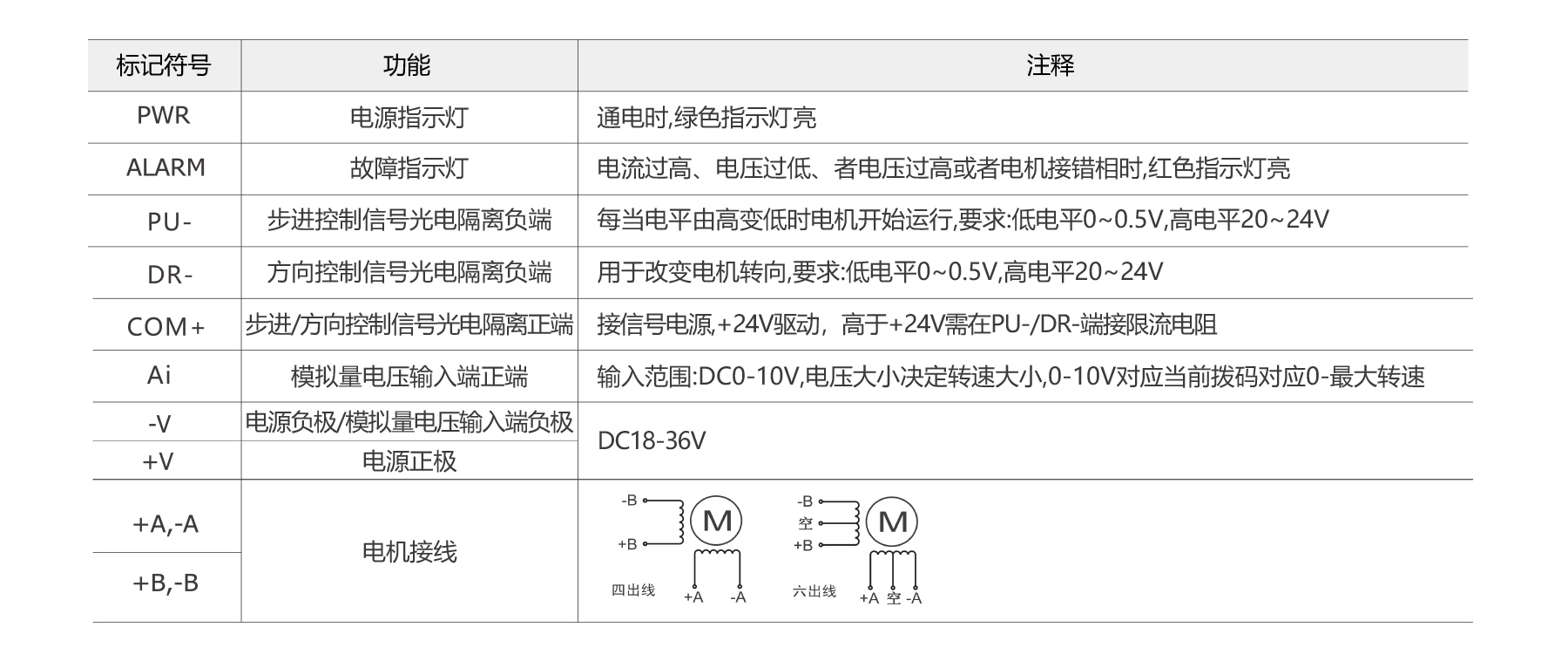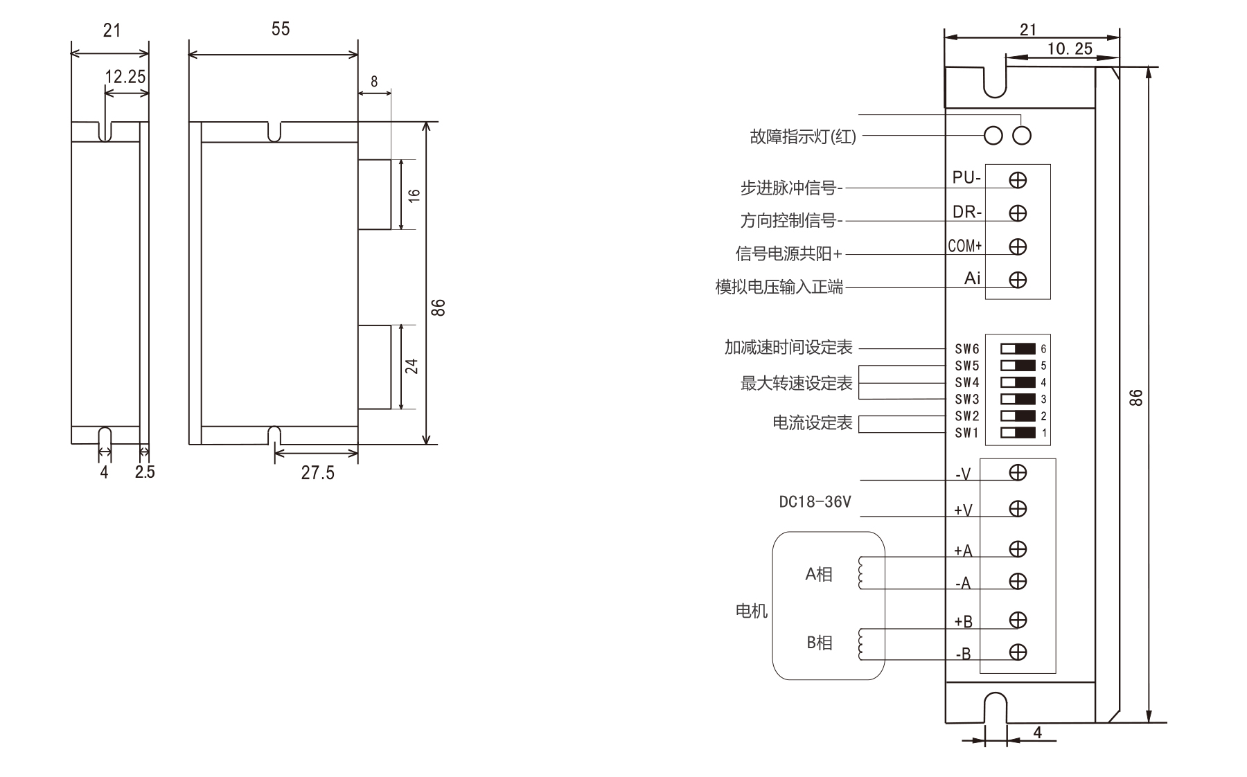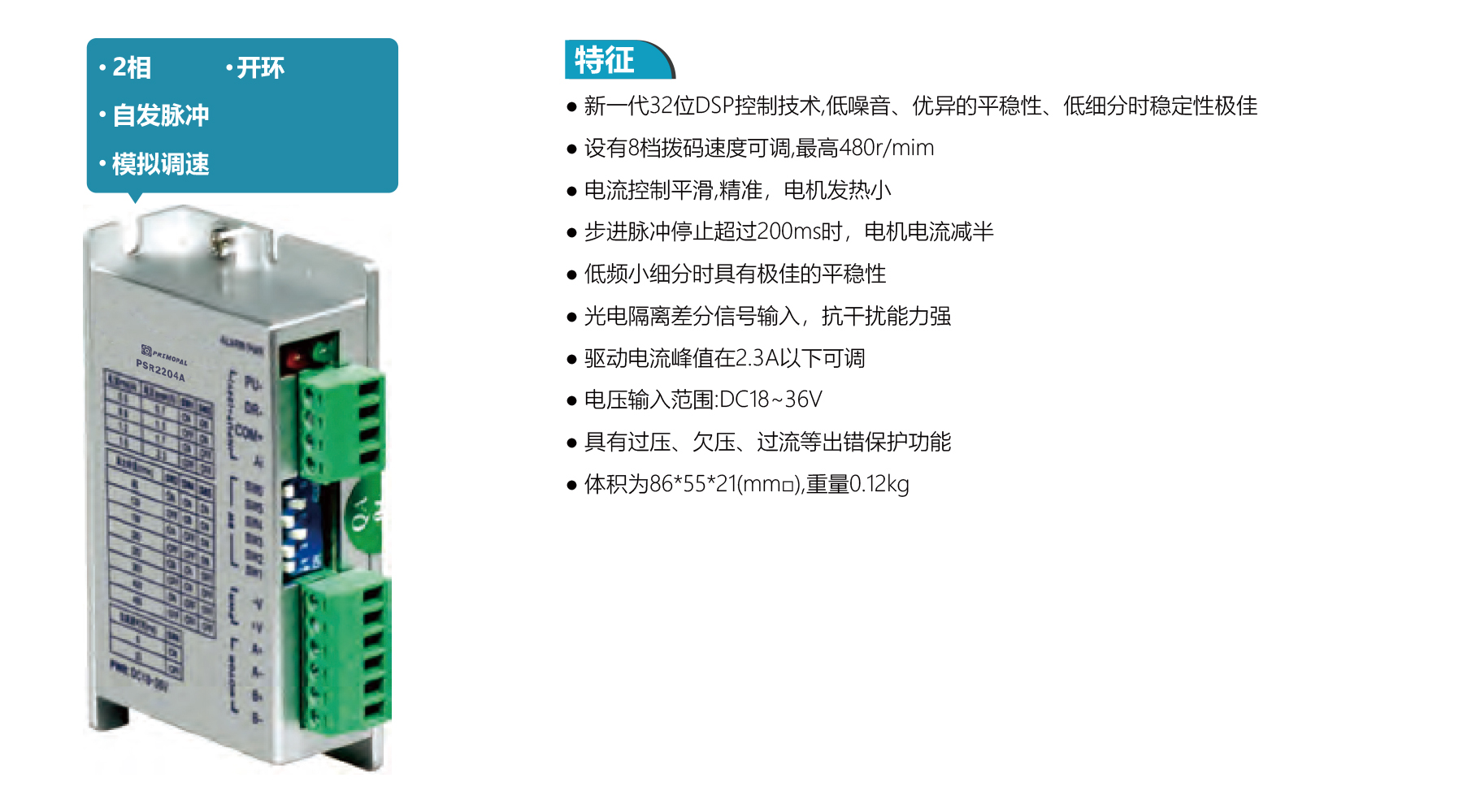 PSR2204A is a 2-phase open-loop spontaneous pulse driver with 32-bit DSP control, ensuring stable, low-vibration operation. It offers 4 constant-torque microstep settings (up to 32 microsteps), analog speed regulation, smooth current control, and opto-isolated inputs. Drive current adjustable below 2.3 A; voltage DC18–36 V. Size: 86×55×21 mm, weight 0.12 kg.
