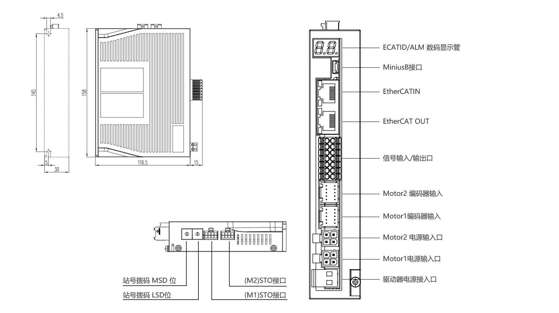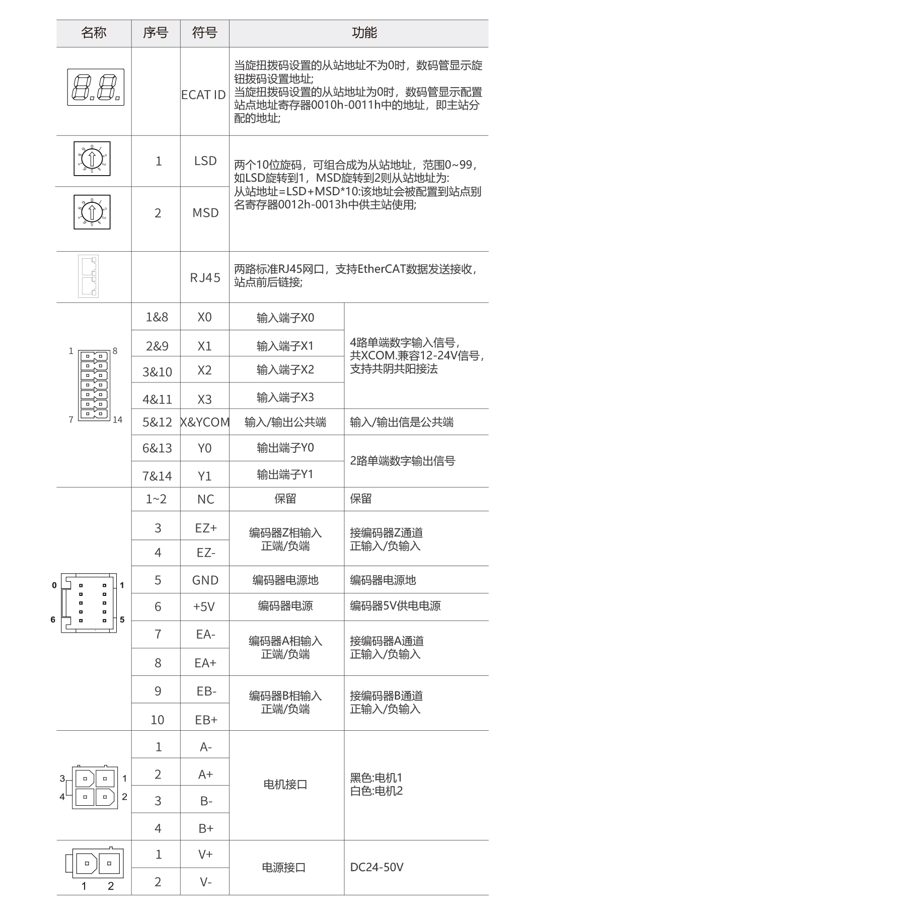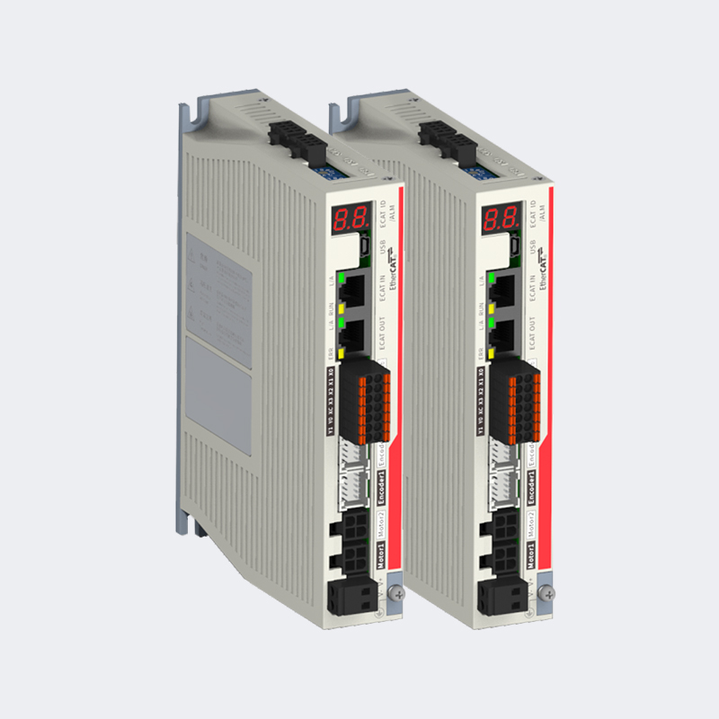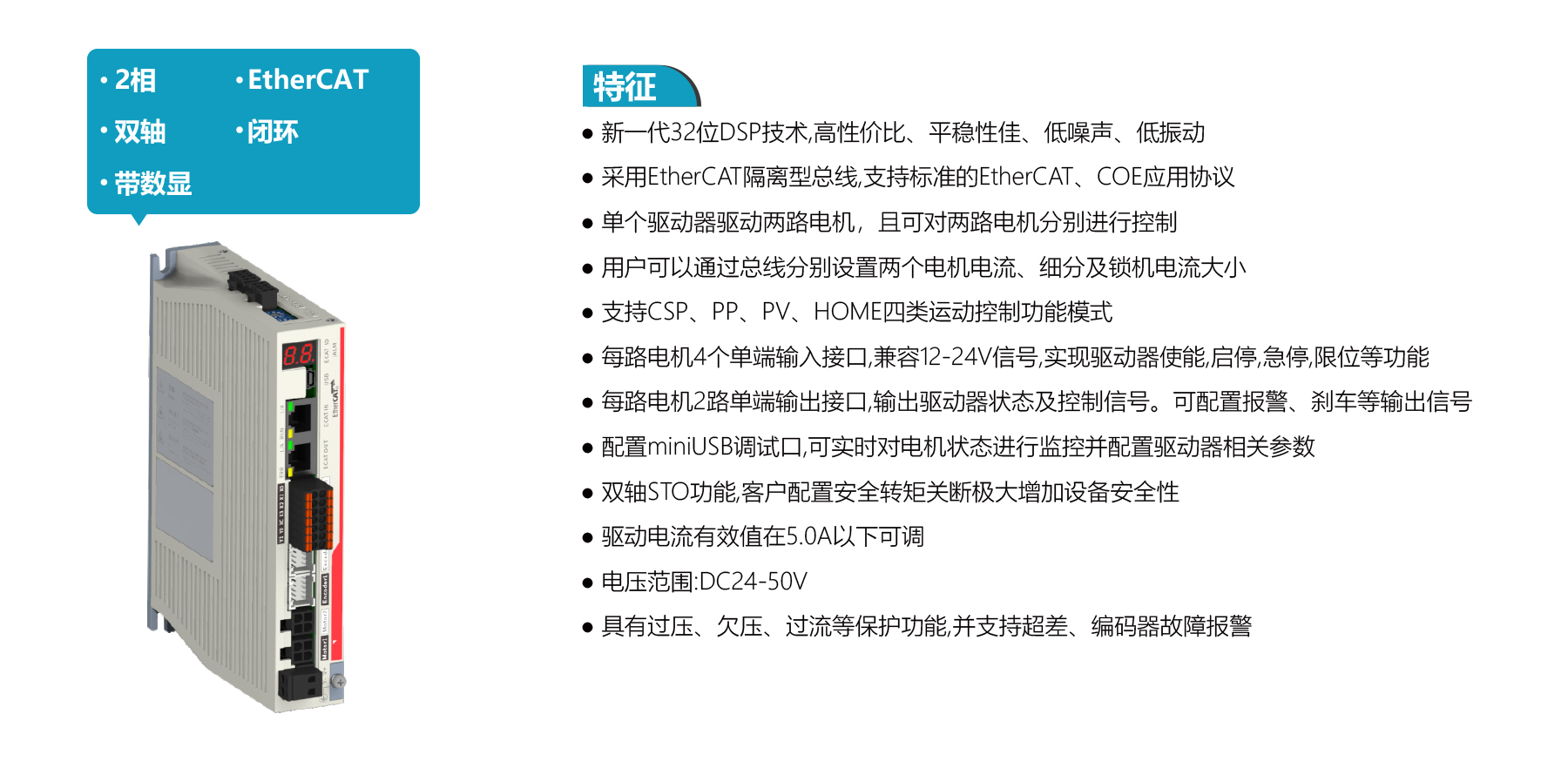 PSS2505E-2D, 2-Phase 2-Axis EtherCAT Closed-Loop Driver. DC24–50V, current ≤5A. 32-bit ARM DSP, smooth, low vibration, with digital display. Single drive controls 2 motors independently. Supports CSP, PP, PV, HOMING modes. Each motor: 4 inputs, 2 outputs. Microstepping adjustable; over/under-voltage, over-current, deviation, encoder fault protection.