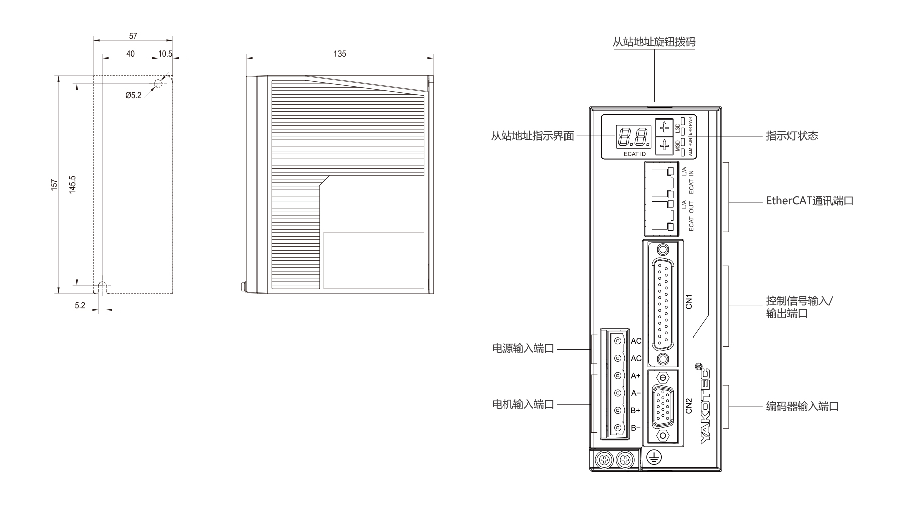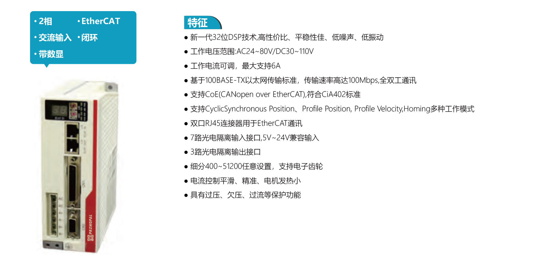 PSS2608EH, 2-Phase EtherCAT AC Closed-Loop Driver. AC24–80V, current ≤6A. 32-bit DSP, smooth, low vibration, with digital display. Supports CSP, PP, PV, HOMING modes. Dual RJ45 ports, 7 opto-isolated inputs, 3 outputs. Microstepping 400–51,200. Over/under-voltage, over-current protection. Suitable for 86 mm (NEMA34) motors.