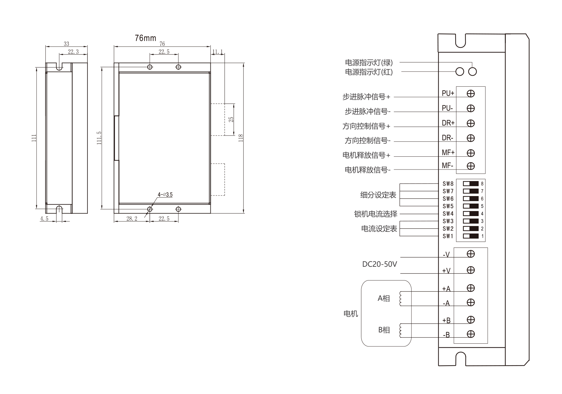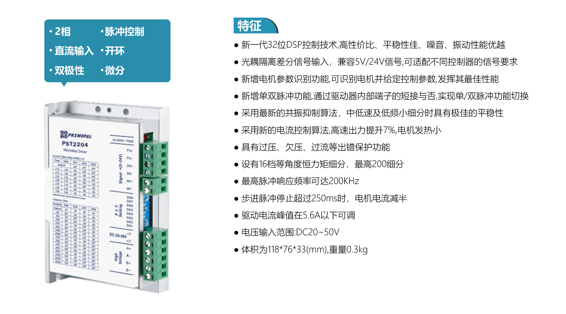 The PST2405P 2-Phase Pulse Control Driver features DC20–50V input, up to 4.0 A adjustable current, and 32-bit DSP control for low-noise, low-vibration performance. Supports up to 200-step microsteps, high-speed output, and single/double pulse mode. Compact 118×76×33 mm size, ideal for NEMA17/23/24 open-loop stepper motors.