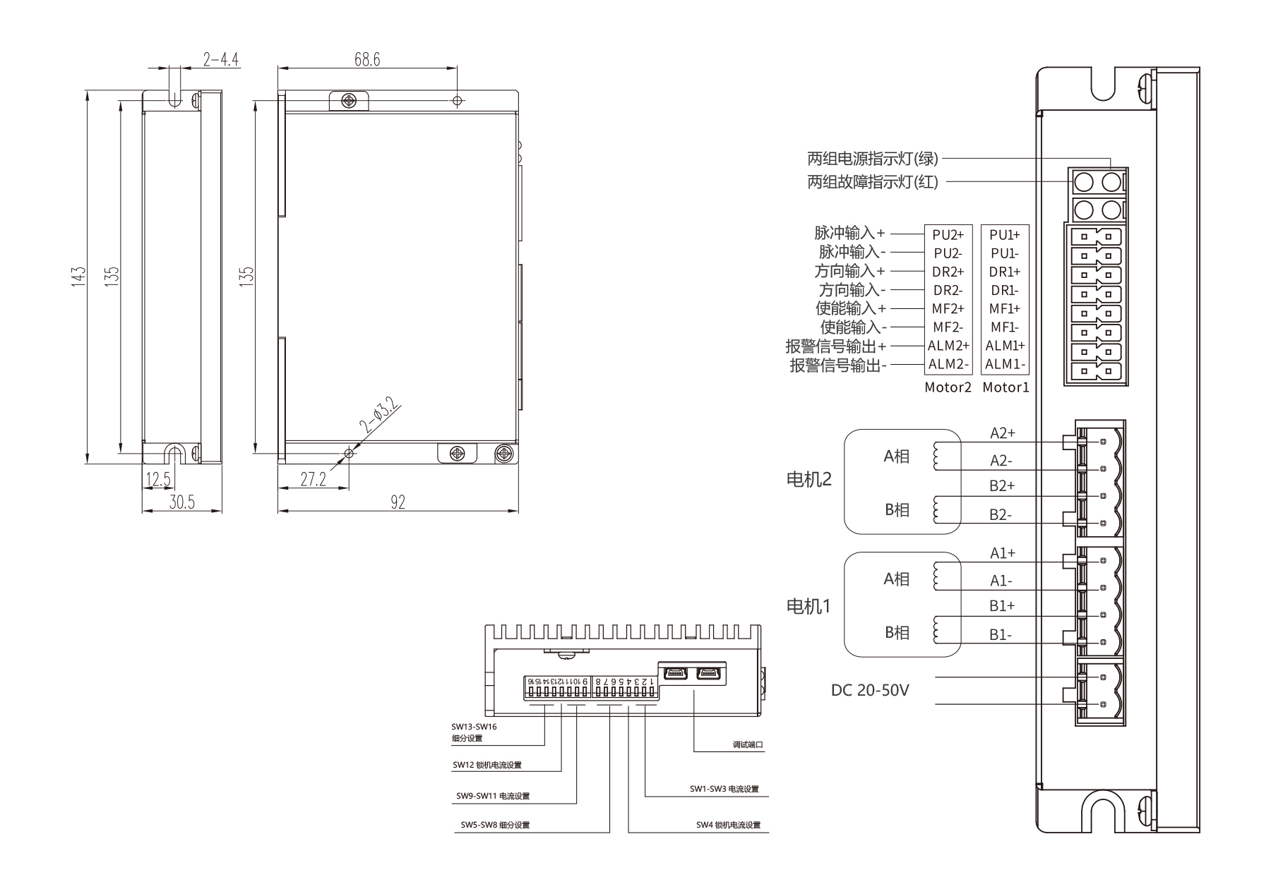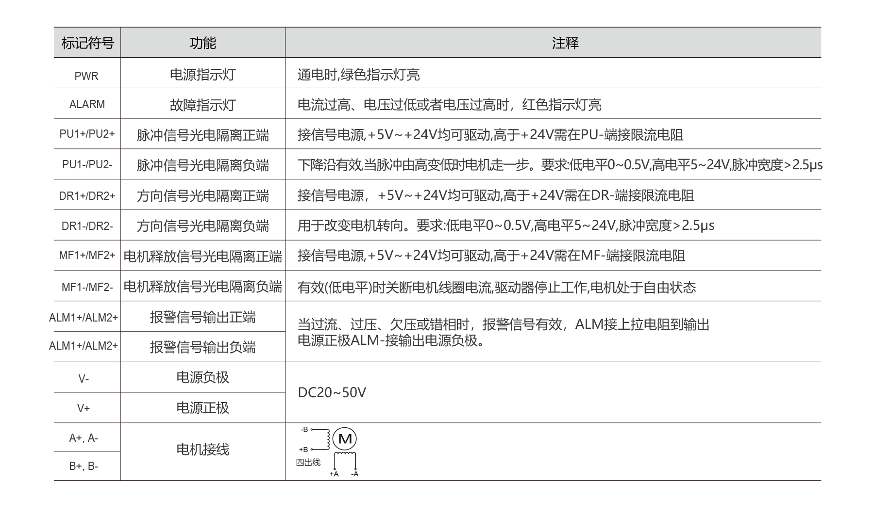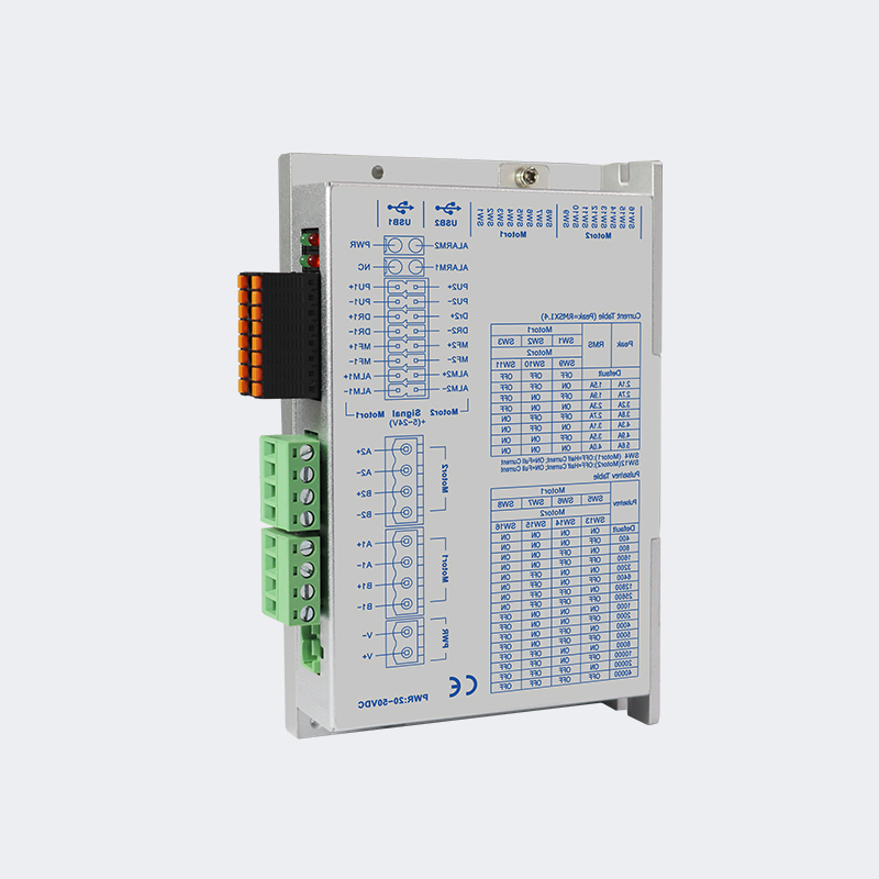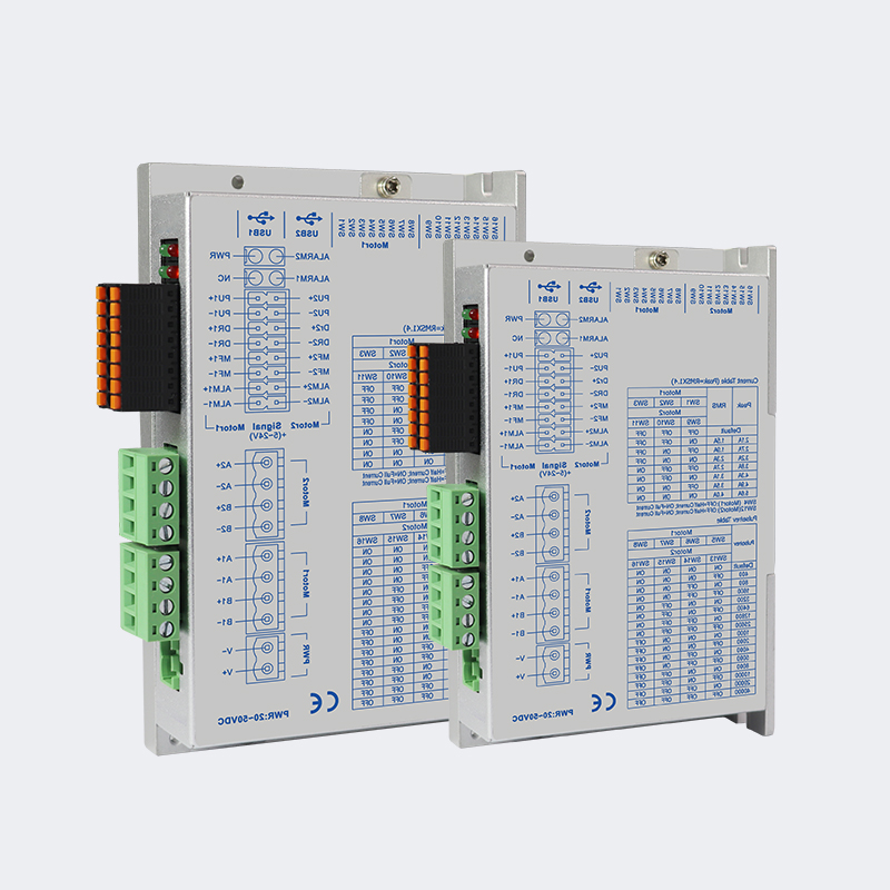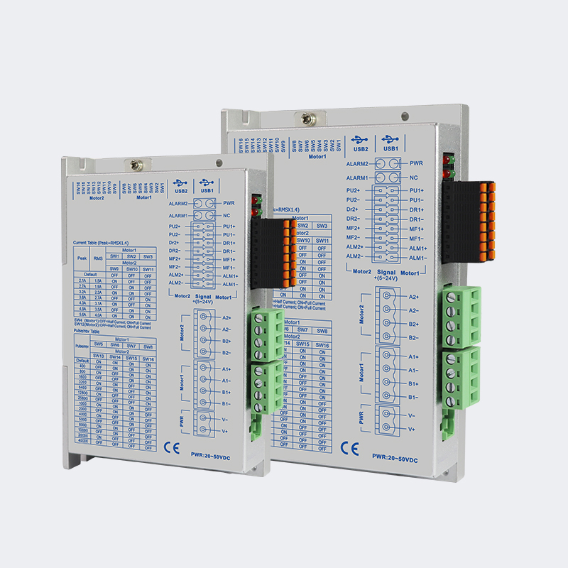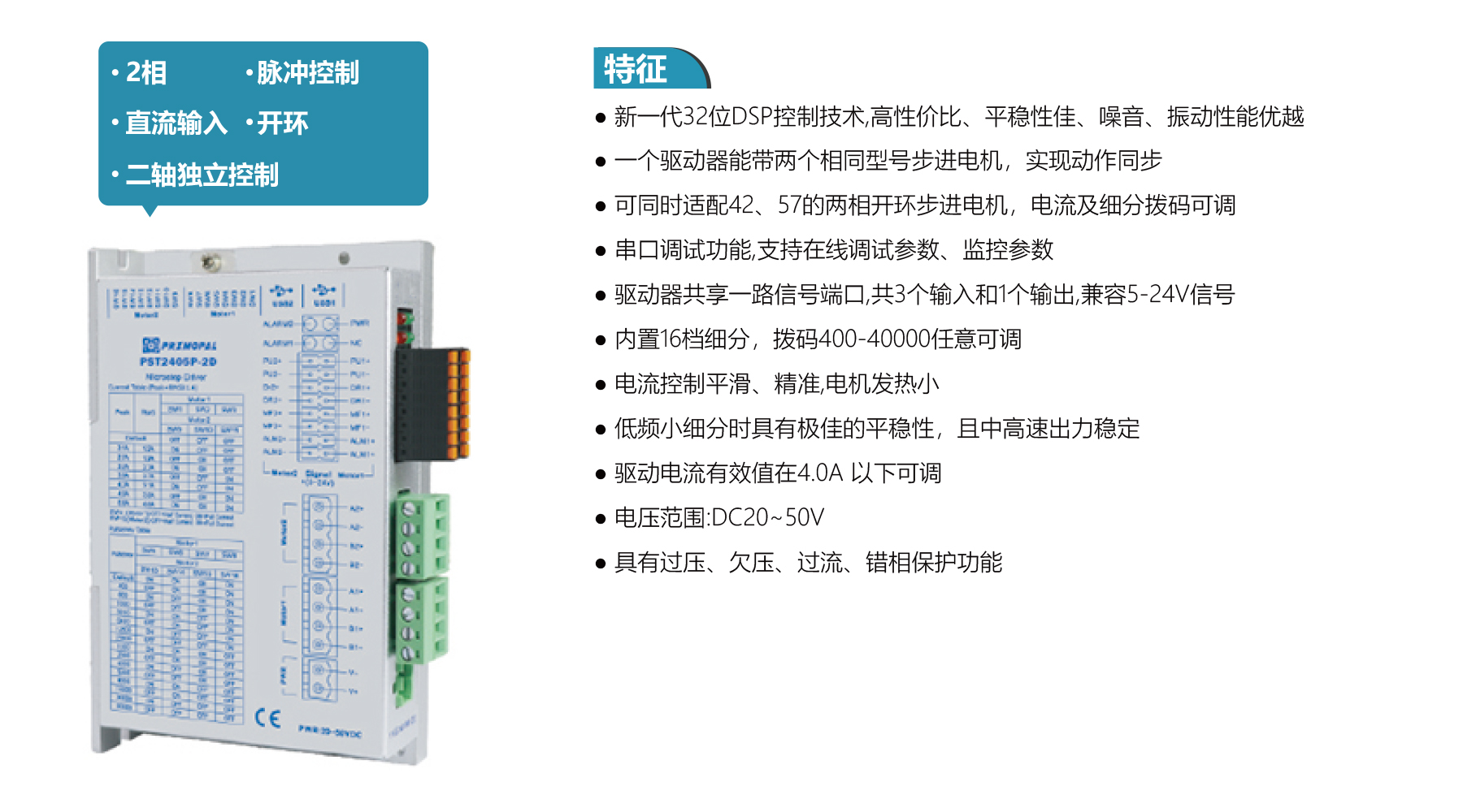 PST2405P-2D is a 2-phase pulse driver (DC20–50V, ≤4.0A) with independent control for two 42/57 stepper motors. Features 16 microstep settings (400–40,000), 32-bit DSP for low noise and stable output, dual 5–24V signal ports, serial debugging, and protections against over/under-voltage, over-current, and phase errors.