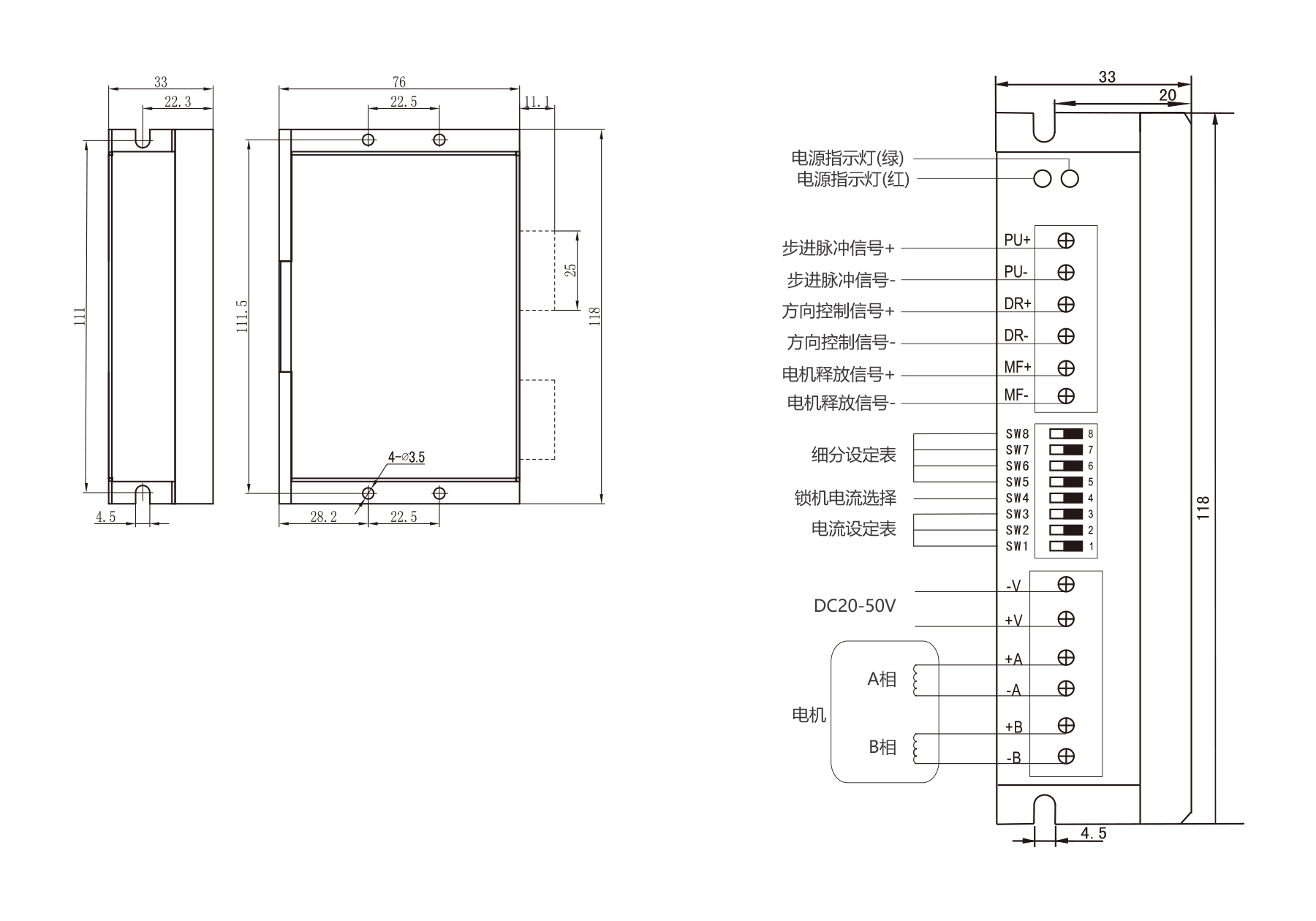 The PST2408P 2-Phase Pulse Control Driver supports DC input up to 80V, with adjustable current below 4.0 A and 32-bit DSP for low-noise, low-vibration operation. It features 16 constant-torque microsteps (up to 200), smooth low-frequency performance, and strong anti-interference signals. Compact 118×76×33 mm, ideal for NEMA23/24/34 open-loop stepper motors.