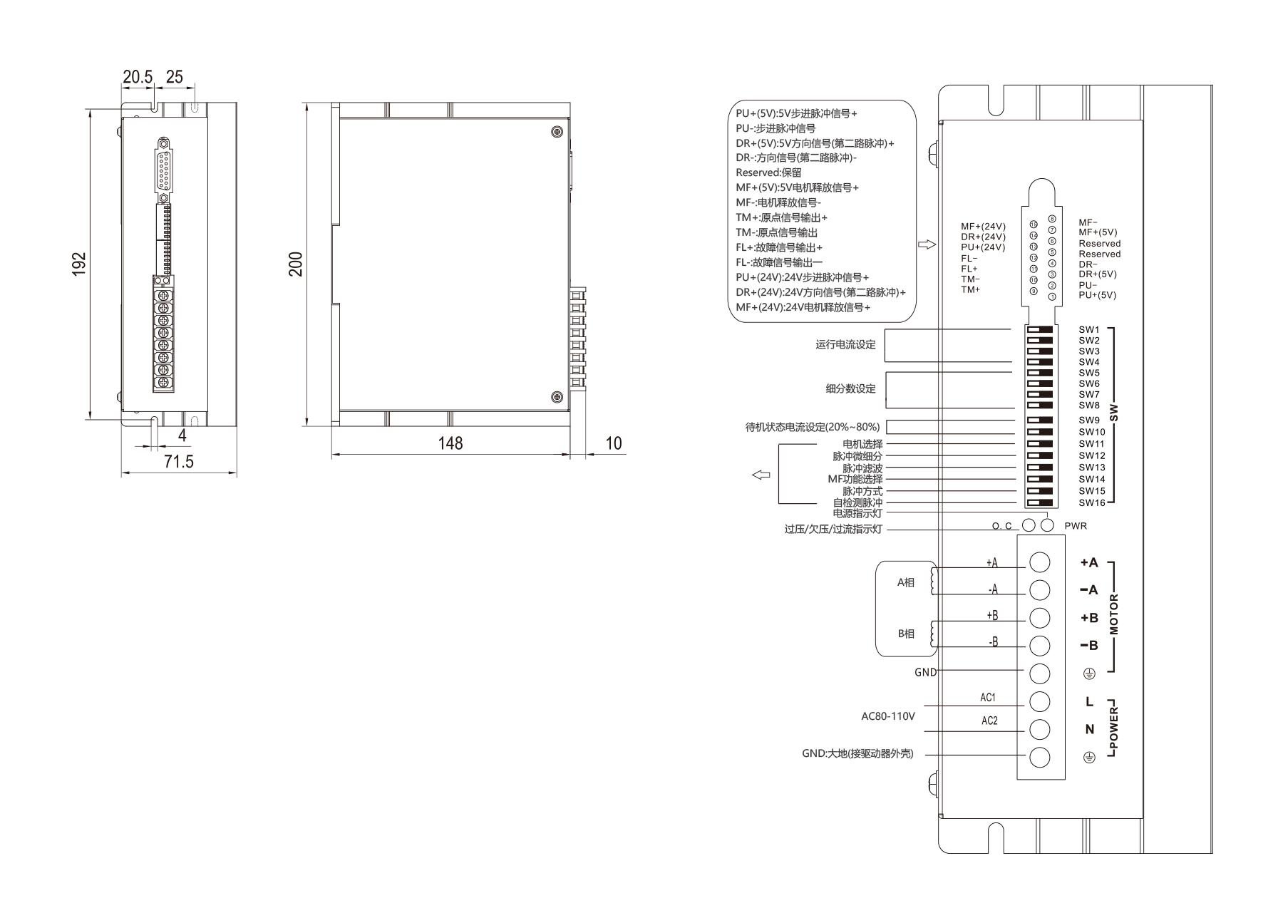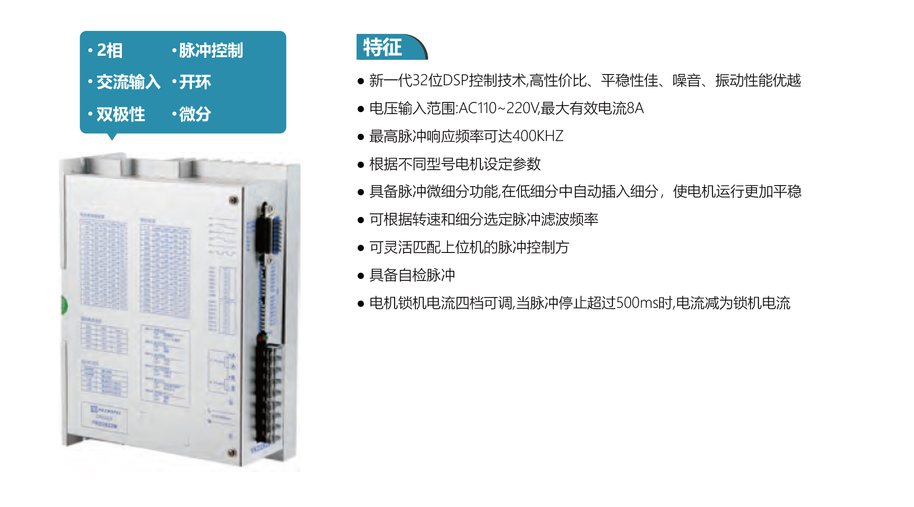 PST2822PH is a 2-phase AC driver (AC110–220V, ≤8A) with 32-bit DSP control for low noise, stability, and up to 125 microsteps. Supports motor model parameter setting, pulse filtering, adjustable lock current, 400kHz pulse rate, and full protections. Ideal for NEMA34–51 stepper motors.