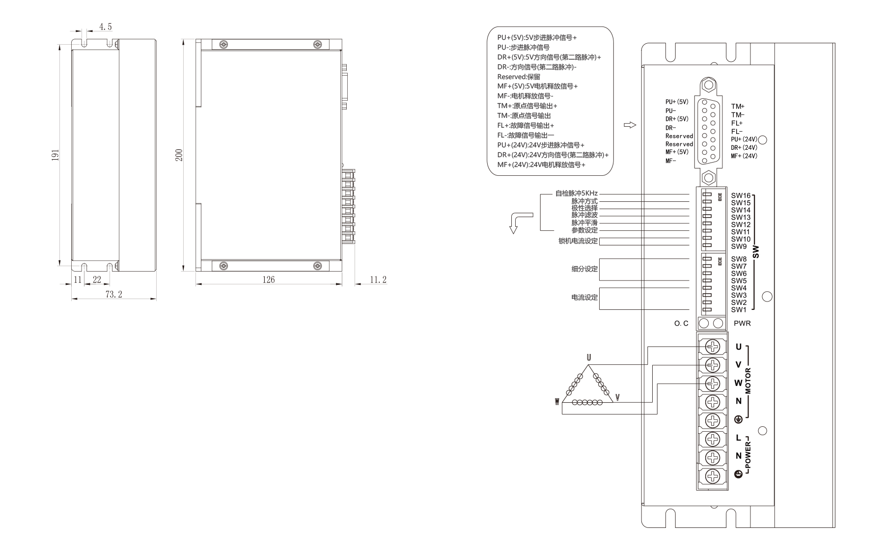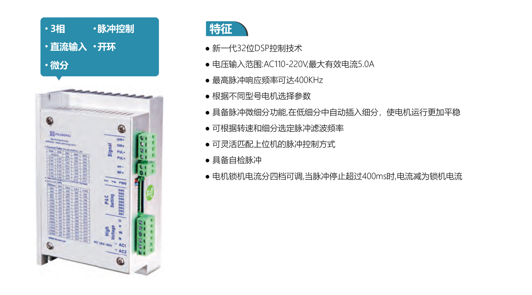 PST3522PH is a 3-phase AC driver (AC110–220V, ≤5.0A) with 32-bit DSP control, ensuring low noise, smooth low-frequency microsteps, and up to 60,000 steps/rev. Features adjustable lock current, 400 kHz max pulse rate, pulse filtering, optical isolation, and full protection. Suitable for NEMA34–51 3-phase open-loop stepper motors.