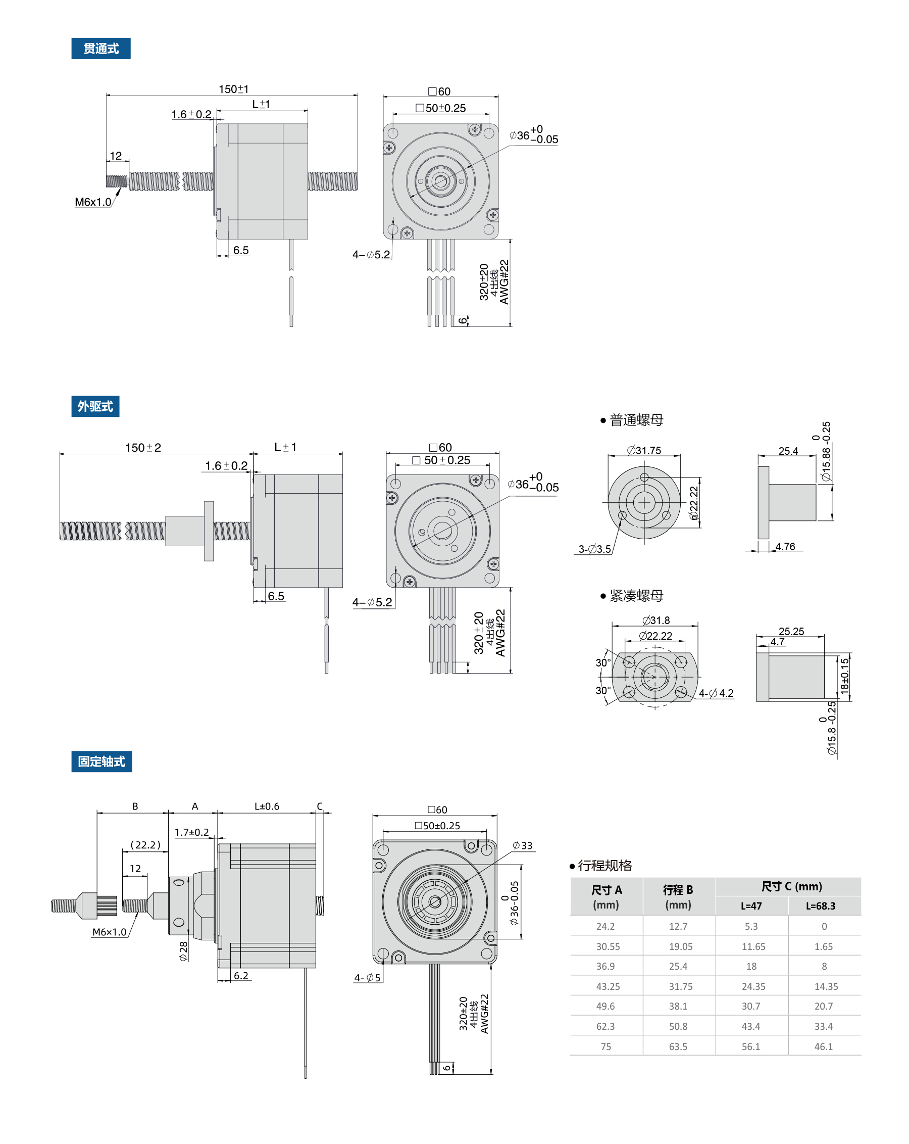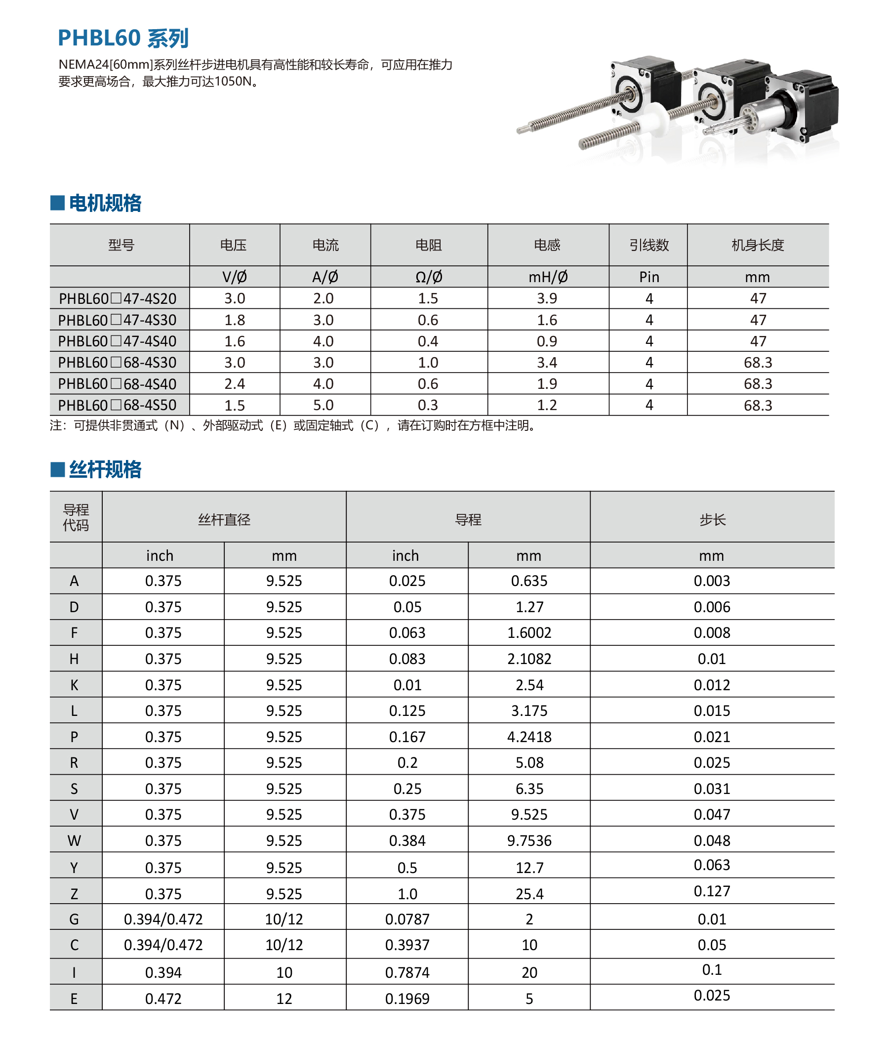 PHBL60 Series NEMA 24 stepper lead screw linear actuator provides high-precision linear motion with multiple lead and travel options. Current 0.3–4.0 A, 4-lead design. Available in non-captive, external, or captive types for industrial automation, CNC, and robotics applications.