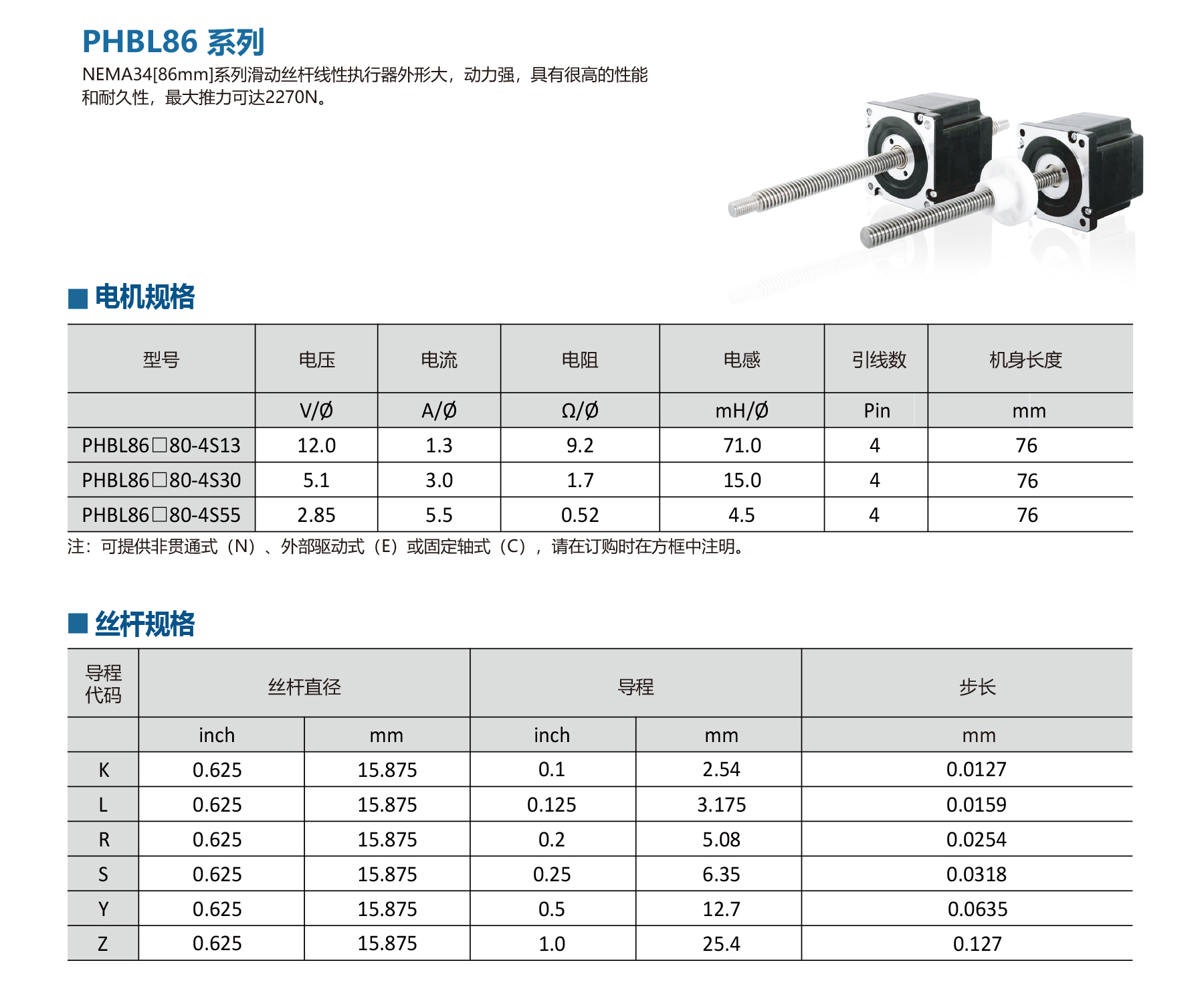 PHBL86 Series NEMA 34 stepper lead screw linear actuator is our largest model, delivering up to 2,270 N continuous thrust. Current 1.3–5.5 A, multiple lead options. Available in non-captive or external types for heavy-duty automation, CNC machinery, and industrial robotics.