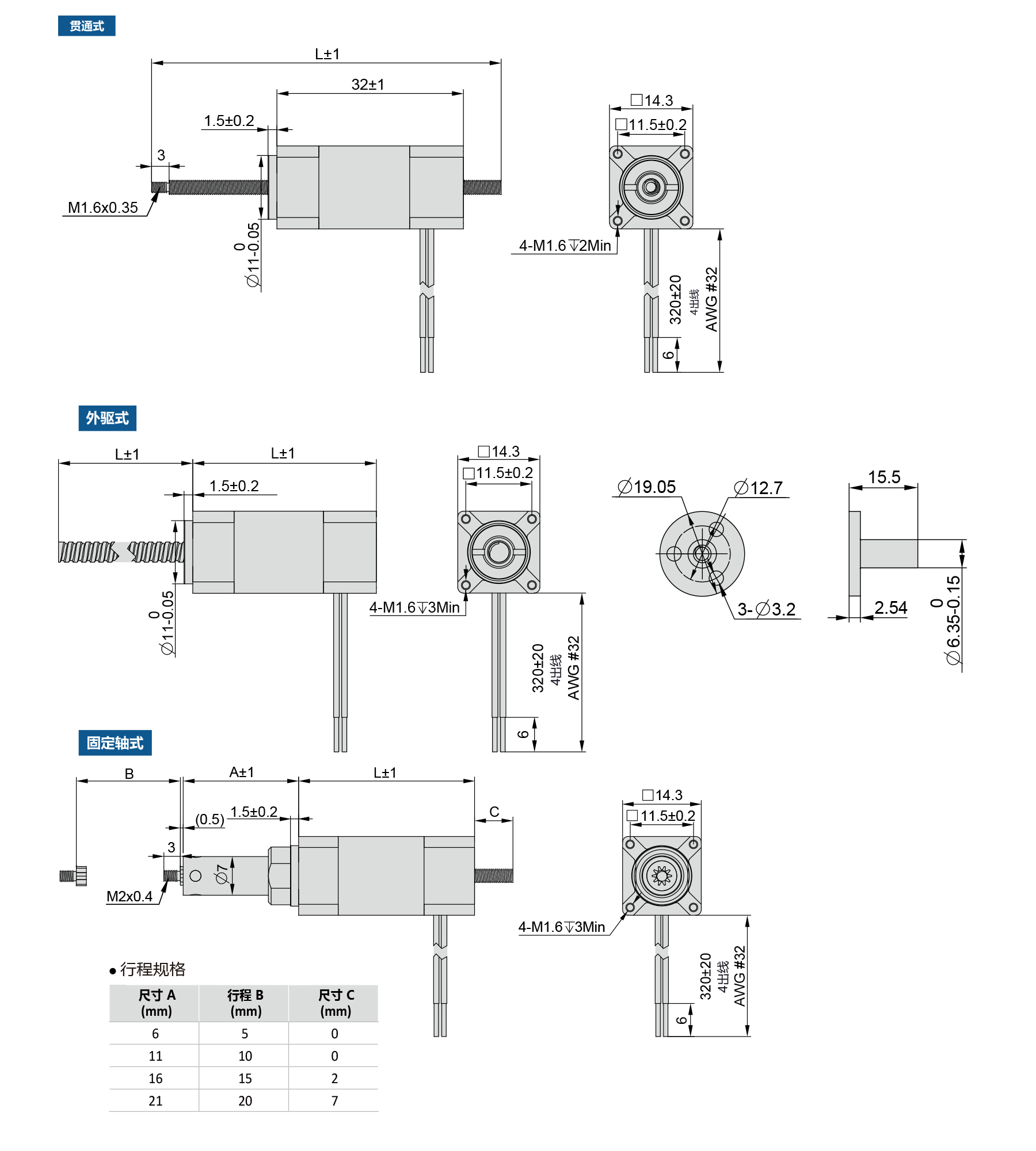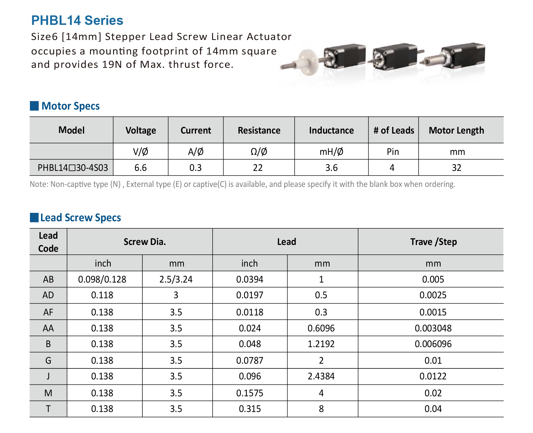 Compact PHBL14 Series NEMA 6 stepper linear actuator with 14 mm square frame delivers up to 19 N max thrust. Voltage 6.6 V, 0.3 Ω resistance, 3.6 mH inductance, 4-lead design. Available in non-captive, external, or captive types for precision automation, medical, and optical systems.