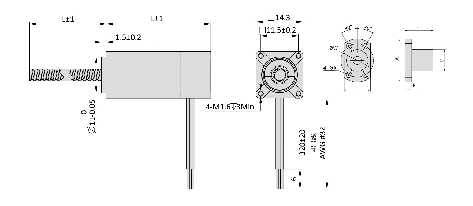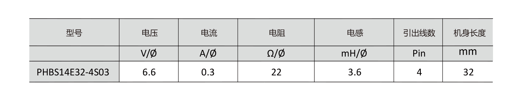 PHBS14 Series stepper motor with ball screw provides precise linear motion in compact 14 mm size. Voltage 6.6 V, current 0.3 A, 4-lead, 32 mm motor length. Ball screw Φ4.0 mm, right-hand thread. Ideal for precision automation, medical devices, and small robotics applications.