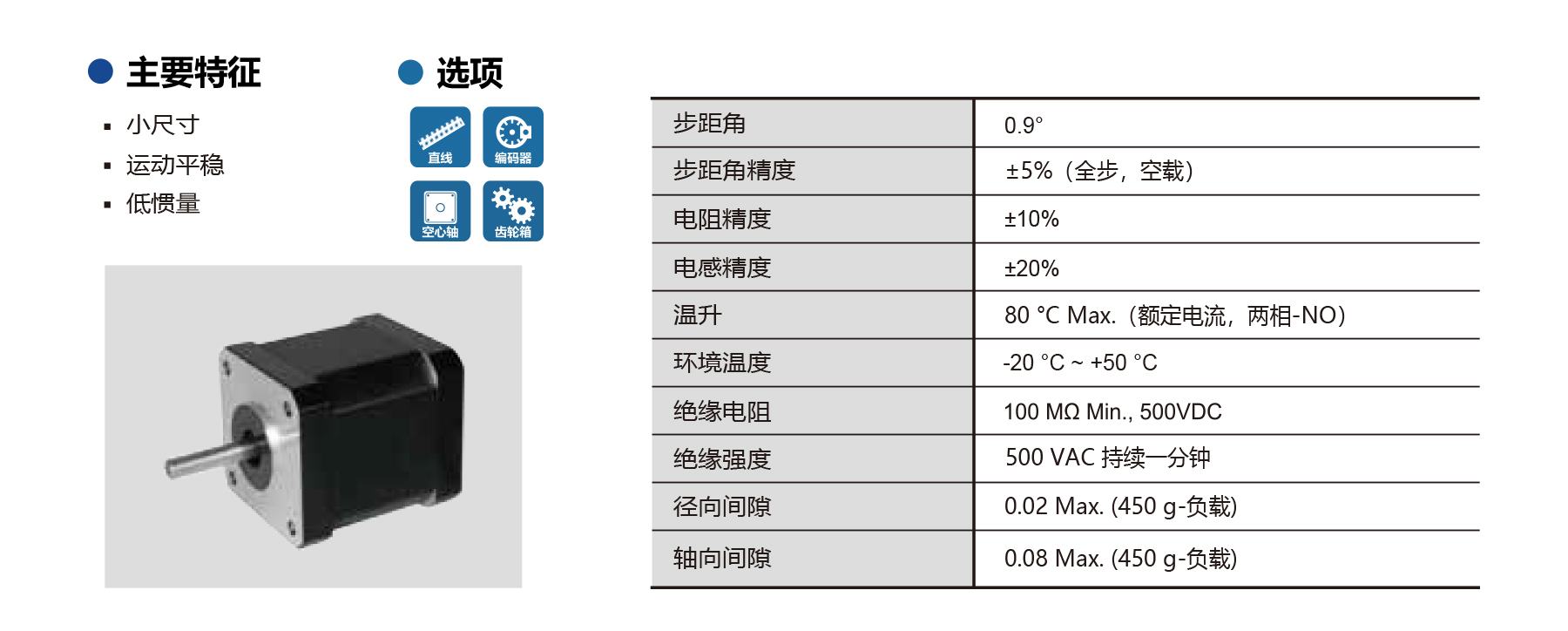 The PHB42M Series hybrid stepper motors, NEMA 17, 0.9° step angle, ±5% accuracy, 2-phase configuration. Compact, low-inertia design with smooth movement, optional encoder, and gearbox. Shaft radial/axial play ≤0.02/0.08 mm, max temperature rise 80°C, operating from -20°C to 50°C. Insulation ≥100 MΩ, dielectric strength 500 VAC/1 min. Ideal for precision automation, optical devices, CNC machinery, and lead screw-driven positioning systems.