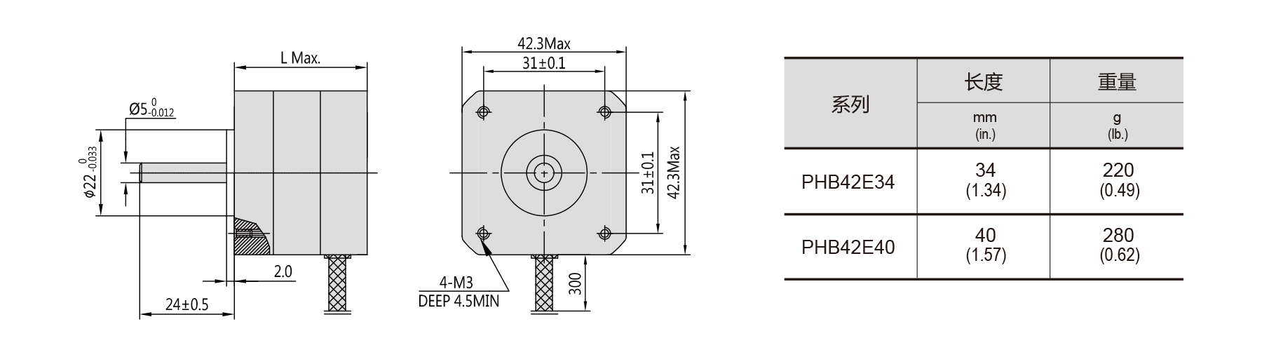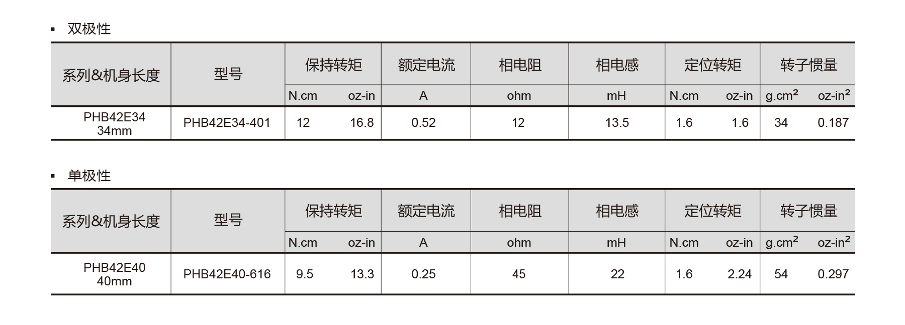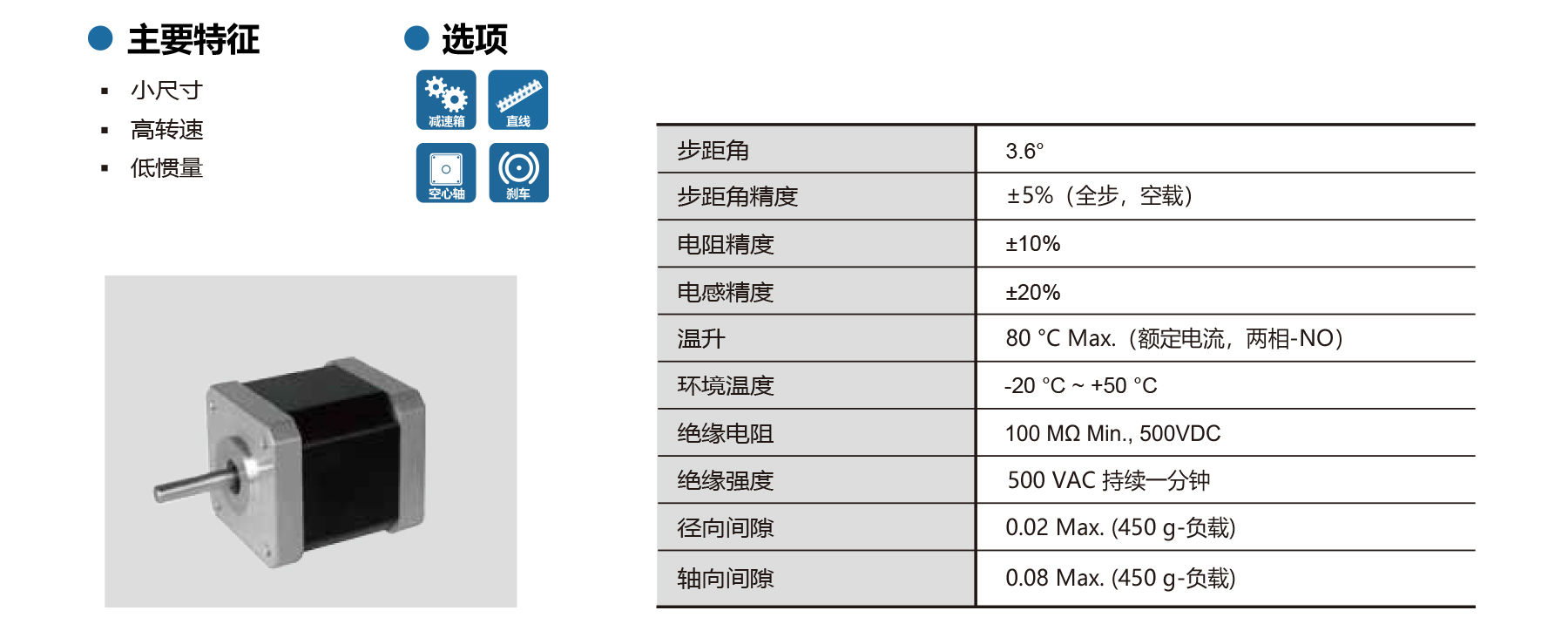 The PHB42E Series hybrid stepper motors, NEMA 17, 3.6° step angle, ±5% accuracy, 2-phase configuration. Compact, high-speed, low-inertia design with smooth movement and optional brake. Shaft radial/axial play ≤0.02/0.08 mm, max temperature rise 80°C, operating from -20°C to 50°C. Insulation ≥100 MΩ, dielectric strength 500 VAC/1 min. Ideal for rotary and linear automation, packing machines, precision machinery, and lead screw-driven systems.