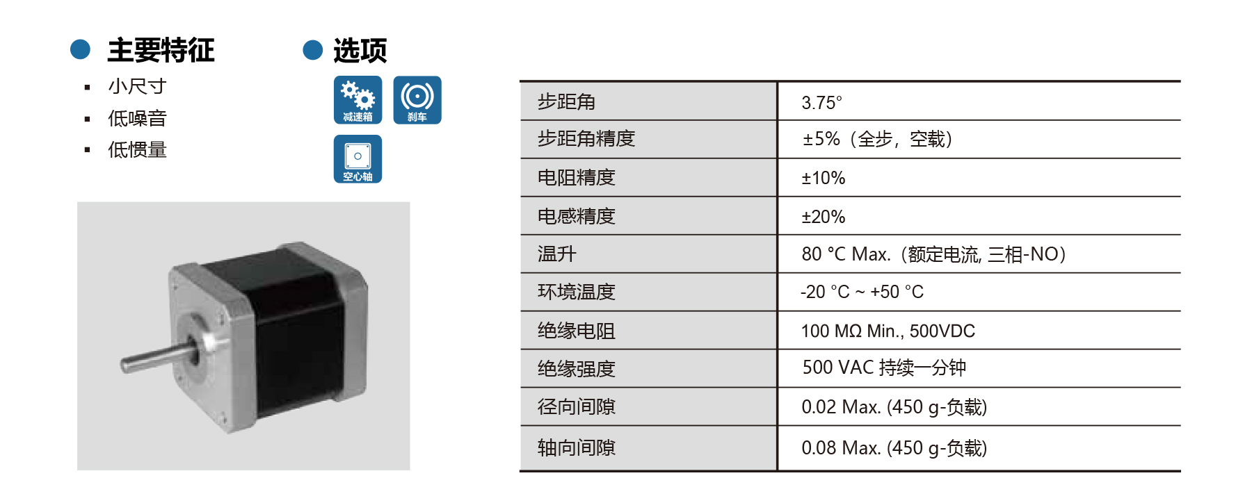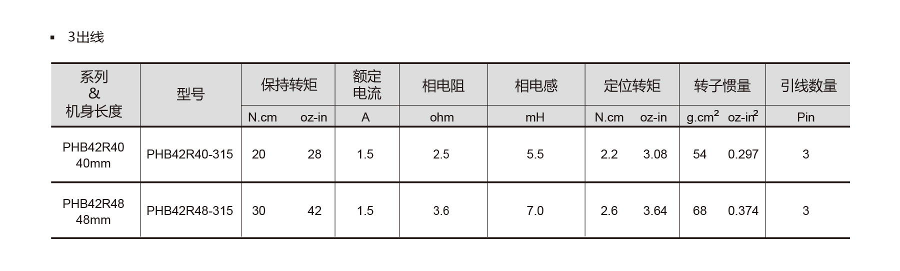 The PHB42R Series NEMA 17 3-phase stepper motors feature a 3.75° step angle with ±5% full-step accuracy, offering low noise, low inertia, and smooth operation for compact applications. Optional brake, encoder, gearbox available. Shaft radial/axial play ≤0.02/0.08 mm, temperature rise max 80°C, insulation ≥100 MΩ, dielectric strength 500 VAC/1 min. Available in lengths from 40 mm to 48 mm, these motors deliver precise, reliable motion for small CNC machines, office automation, and industrial devices where compact size and efficient performance are essential.