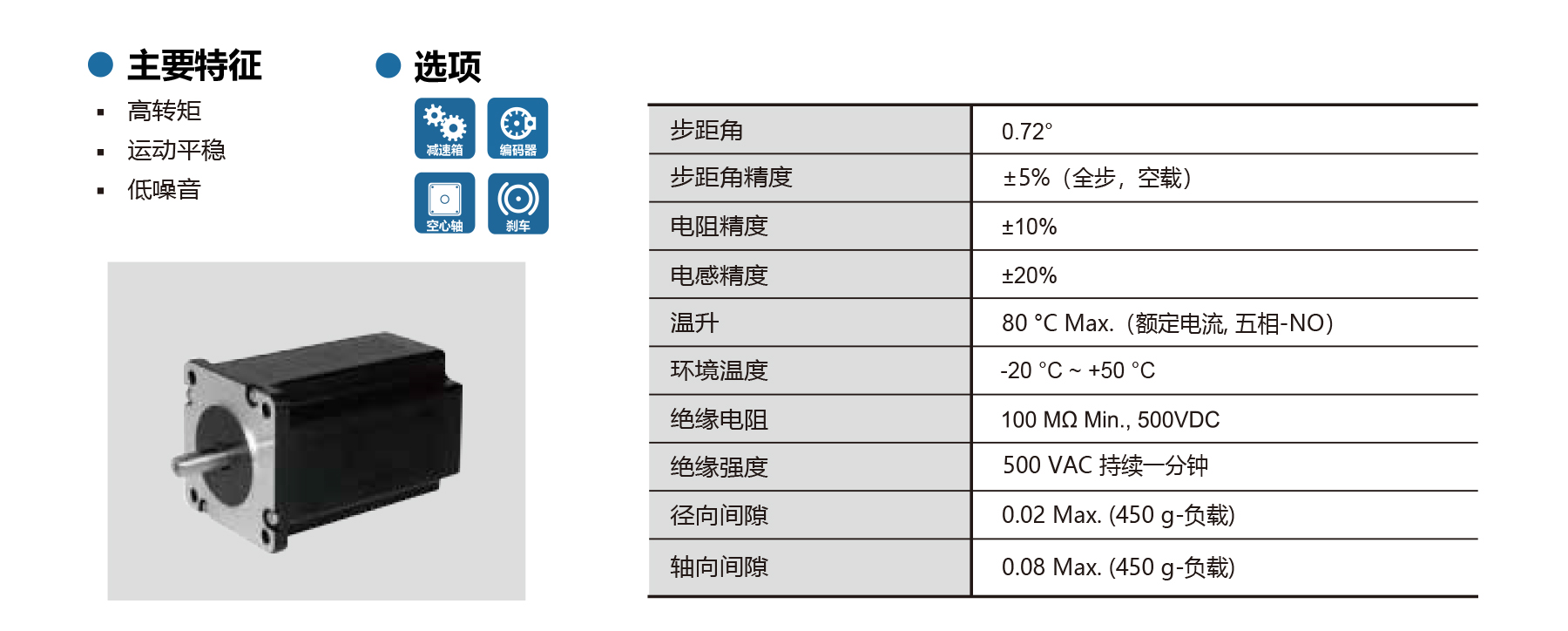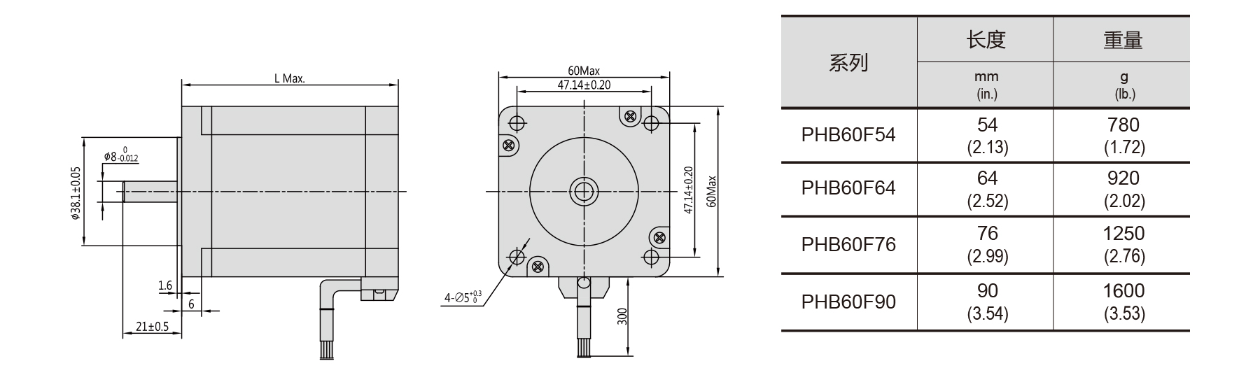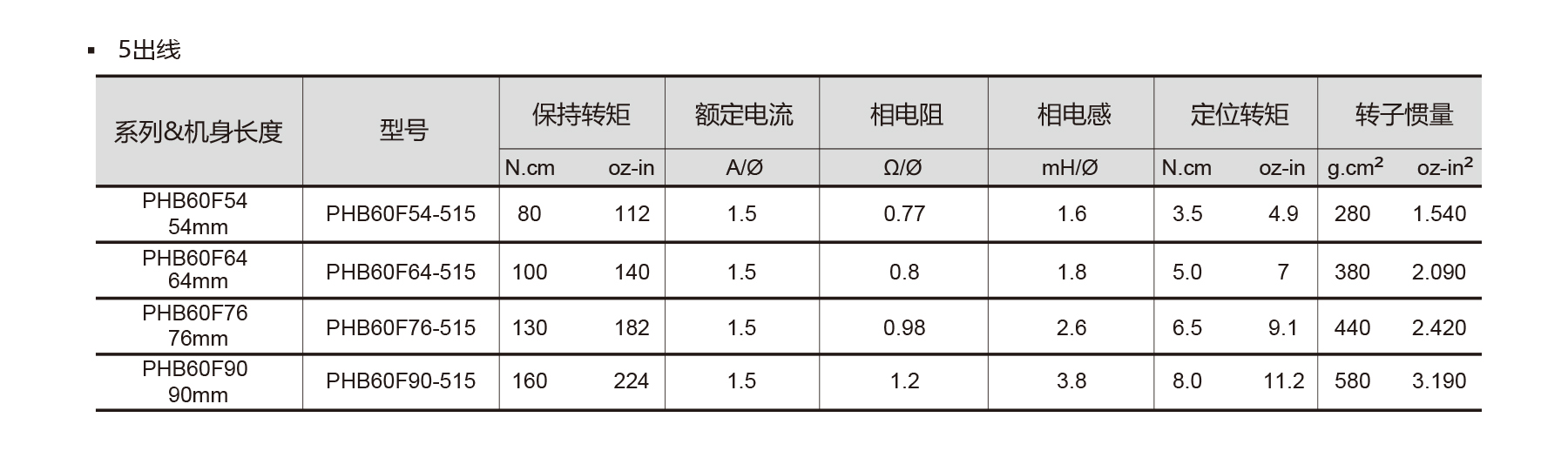 The PHB60F Series NEMA 24 5-phase stepper motors deliver high torque and smooth 0.72° step movement with ±5% full-step accuracy. Engineered for low-noise, precise operation, these motors are ideal for CNC machines, and automation systems. Rated for 5-phase operation, they feature a maximum temperature rise of 80°C, insulation resistance ≥100 MΩ, and dielectric strength of 500 VAC for 1 minute. Shaft radial and axial play are strictly controlled at 0.02 mm and 0.08 mm. Available in multiple lengths (54–90 mm) with 5-wire connections, PHB60F motors provide reliable, high-precision performance for demanding applications.