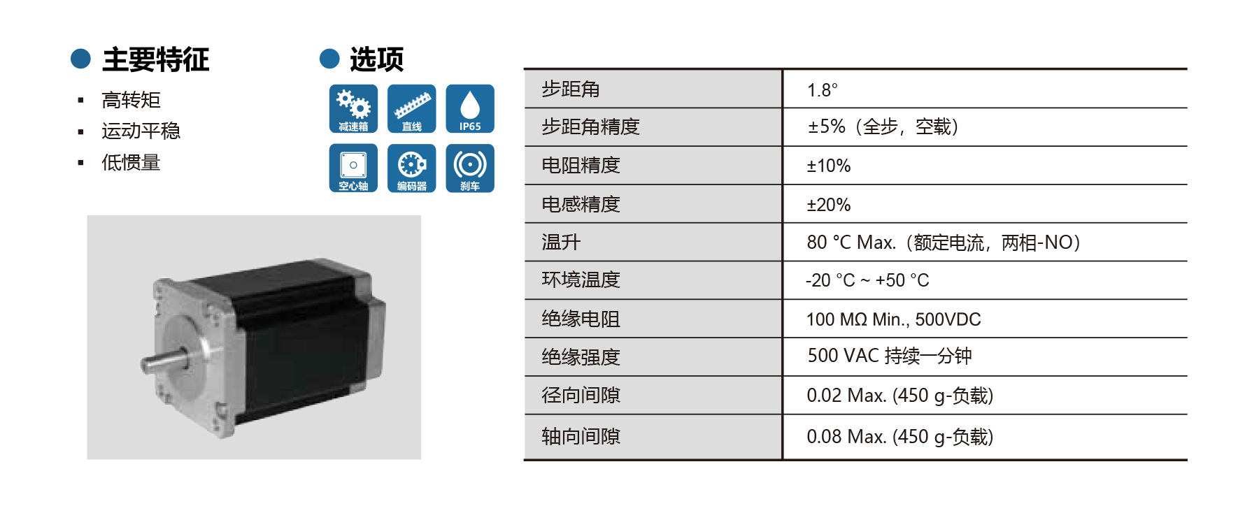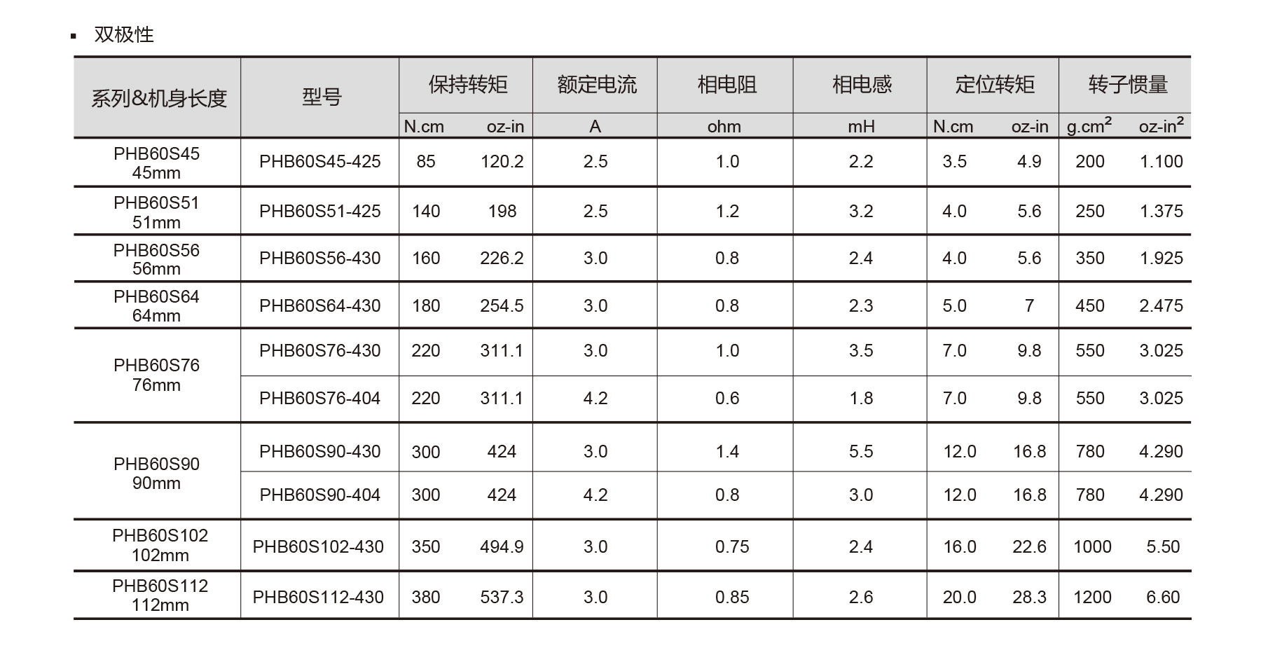 The PHB60S Series NEMA 24/60 2-phase stepper motors feature 1.8° step angle with ±5% full-step accuracy, high torque, smooth movement, and high-inertia design for stable operation. Optional brake, encoder, gearbox available. Shaft radial/axial play ≤0.02/0.08 mm, max temperature rise 80°C, insulation ≥100 MΩ, dielectric strength 500 VAC/1 min. Available in 45–112 mm lengths, these motors are ideal for CNC machinery, textile equipment, industrial automation, and industrial applications requiring precision, reliability, and strong torque performance.