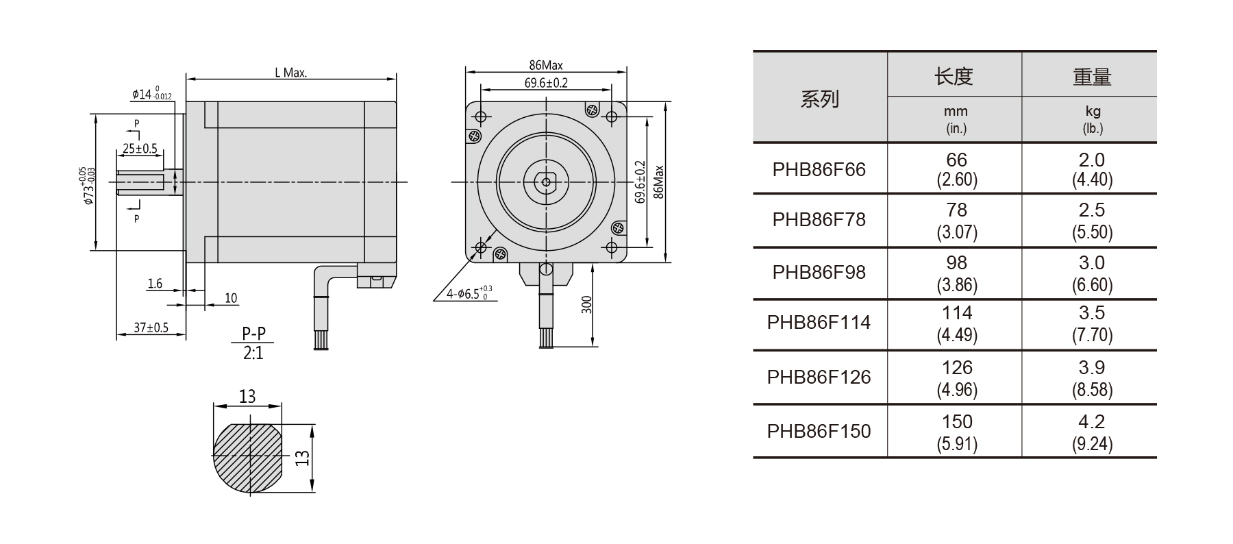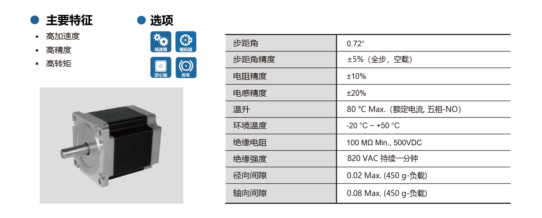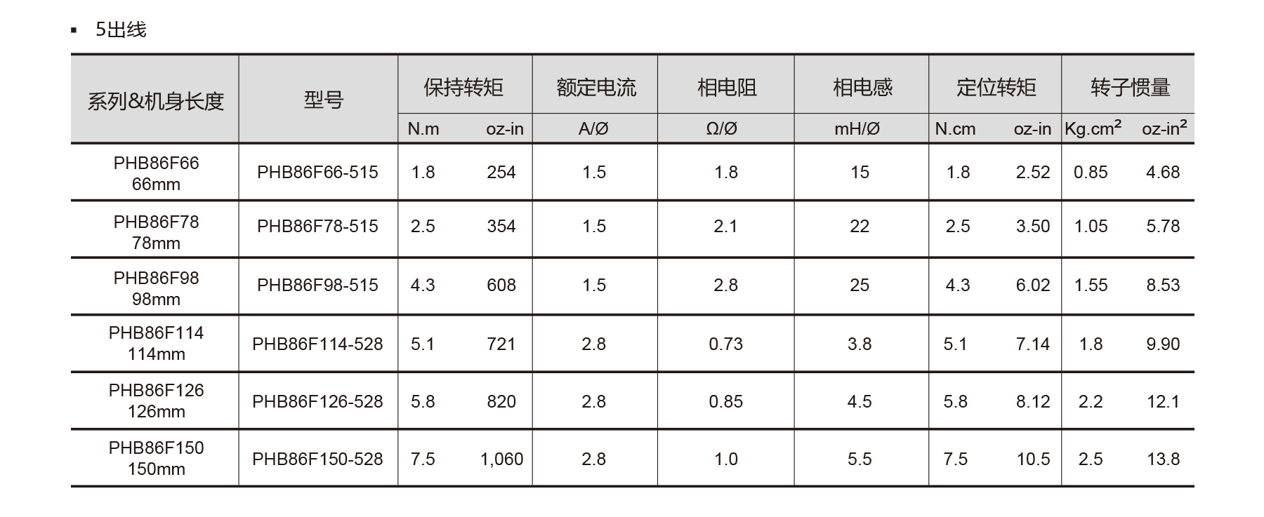 The PHB86F Series NEMA 34 5-phase stepper motors provide high torque, high acceleration, and smooth 0.72° step motion with ±5% full-step accuracy. Designed for precision applications, these motors operate quietly and reliably with 5-phase connection. Rated for continuous use with a maximum temperature rise of 80°C, they feature insulation resistance ≥100 MΩ, dielectric strength of 1500 VAC for 1 minute, and minimal shaft play (radial 0.02 mm, axial 0.08 mm). Available in multiple lengths (66–150 mm), PHB86F motors are ideal for CNC machinery, automation systems, and robotic applications demanding accuracy and performance.