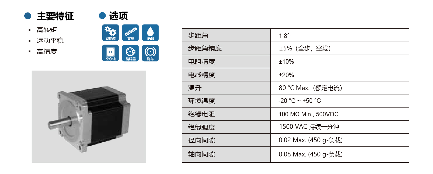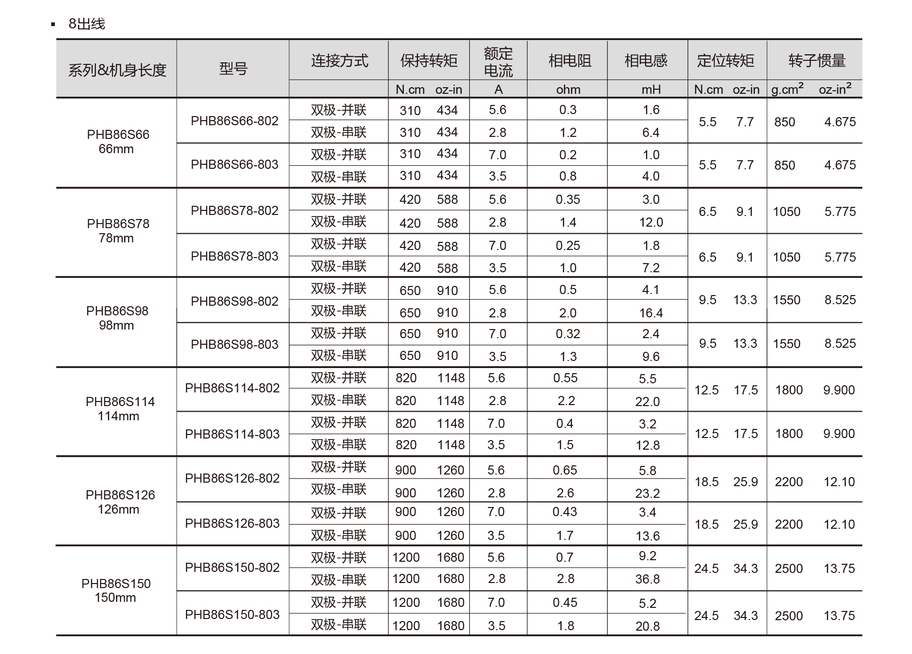 The PHB86S Series NEMA 34 2-phase stepper motors feature 1.8° step angle with ±5% full-step accuracy, high torque, and smooth, precise movement. Optional brake, encoder, gearbox available. Shaft radial/axial play ≤0.02/0.08 mm, temperature rise max 80°C, insulation ≥100 MΩ, dielectric strength 1500 VAC/1 min. Available in 66–150 mm lengths with bipolar-parallel, bipolar-series or unipolar wiring, these motors deliver reliable performance for CNC machines, textile equipment, industrial automation, and industrial equipment requiring high torque, precision, and low noise.