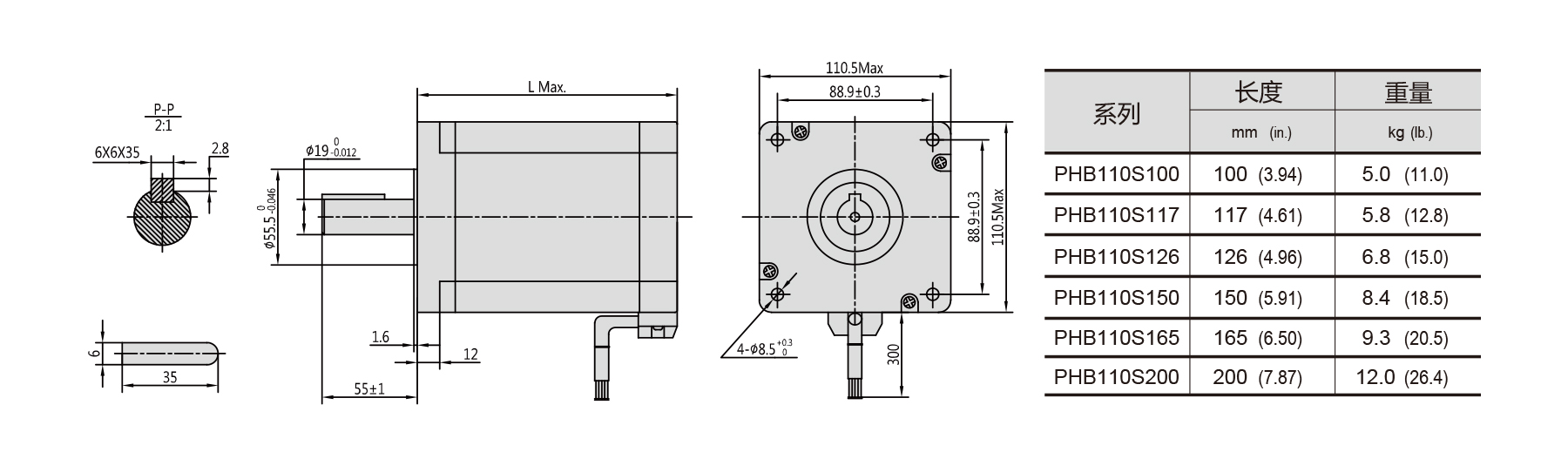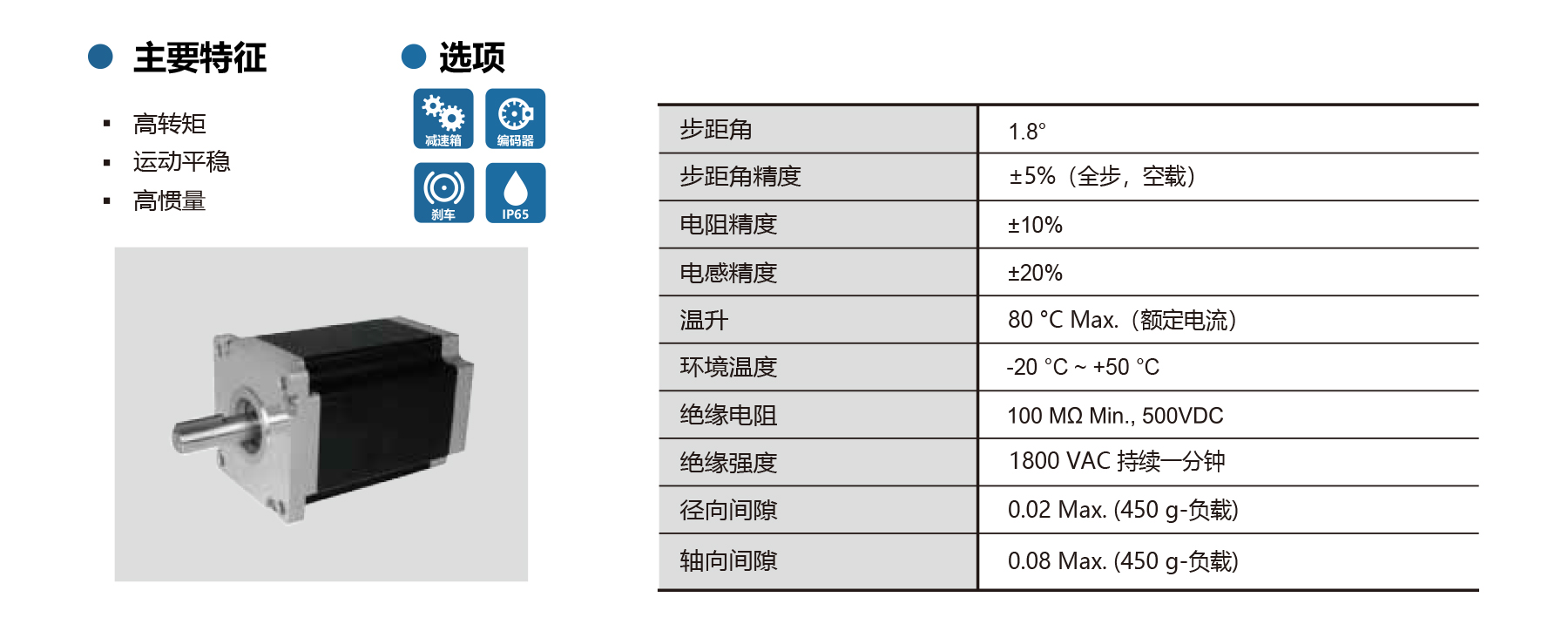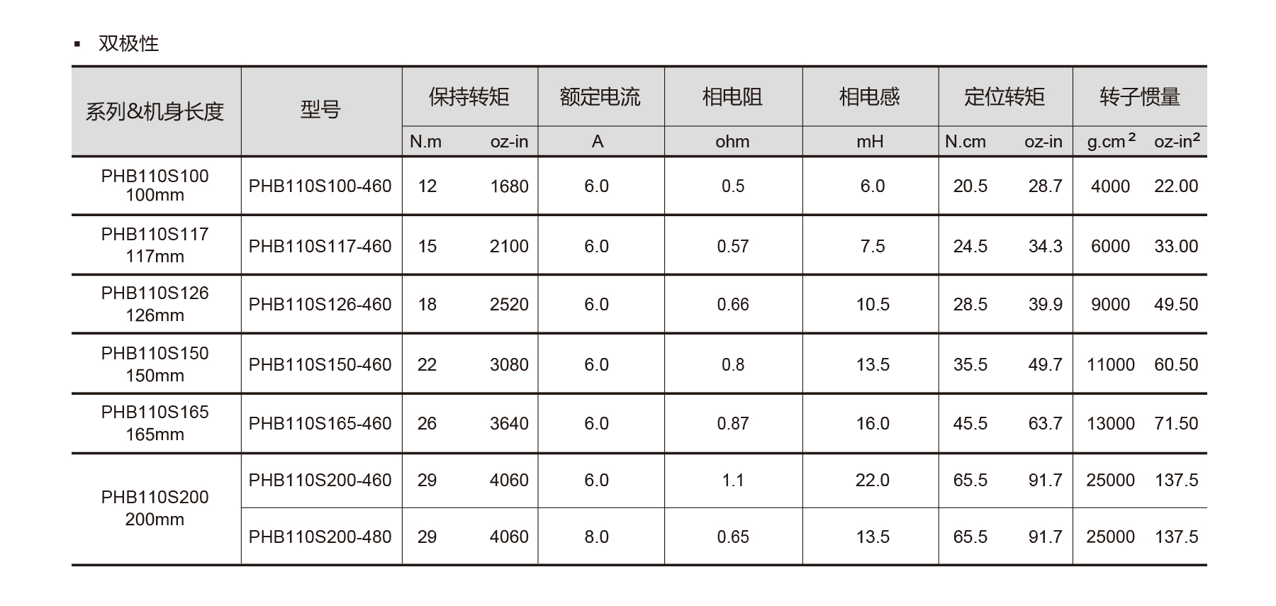 The PHB110S Series NEMA 42 2-phase stepper motors feature 1.8° step angle with ±5% full-step accuracy, high torque, and smooth, precise movement. Optional brake, encoder, gearbox available. Shaft radial/axial play ≤0.02/0.08 mm, temperature rise max 80°C, insulation ≥100 MΩ, dielectric strength 1800 VAC/1 min. Available in 100–200 mm lengths with bipolar wiring, these motors deliver reliable performance for CNC machines, engraving equipment, industrial automation, and industrial equipment requiring high torque, high inertia, and low noise.