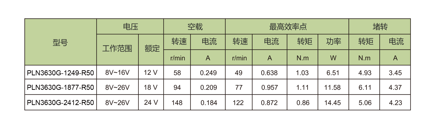 PLN3630G-R50 Brushless DC Geared Motor – Inner Rotor Series. Output: ~2–18 W, Weight: ~260 g. Motor terminals: VCC, FG, GND, CW/CCW, PWM, BRAKE. Operating voltage: 8–26 V. Typical applications include industrial equipment, power tools, automobiles, household appliances, personal care, communication, and medical devices. Compact geared motor offering reliable torque and speed performance for precise motion control.