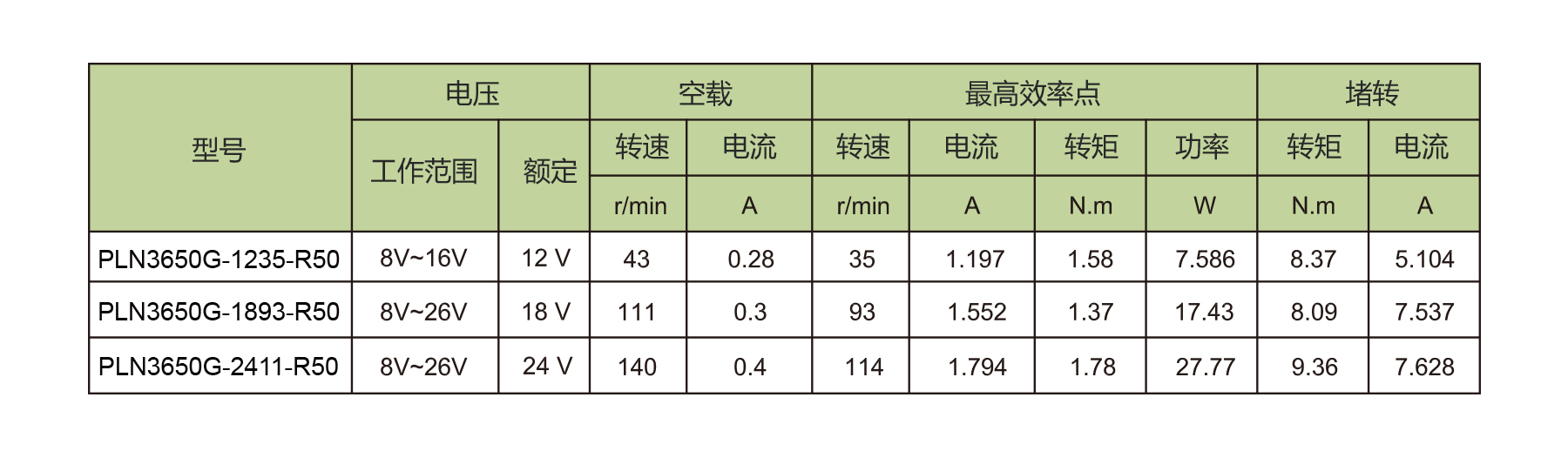 PLN3650G-R50 Brushless DC Geared Motor – Inner Rotor Series. Output: ~5–40 W, Weight: ~300 g. Motor terminals: VCC, FG, GND, CW/CCW, PWM, BRAKE. Operating voltage: 8–26 V. Typical applications include industrial equipment, power tools, automobiles, household appliances, personal care, communication, and medical devices. Compact geared motor designed for high torque and efficient, precise motion control.