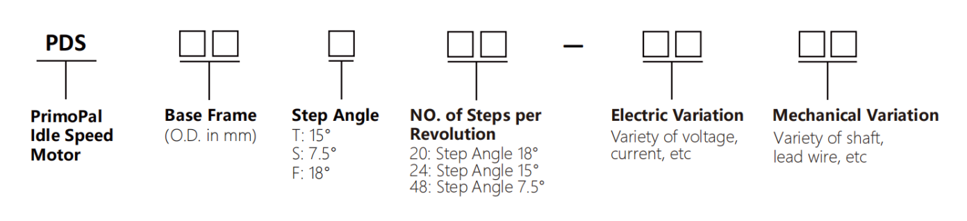 Naming method Home / Products / PM Steppers / Idle Speed PART NUMBER NAMING RULE Please follow the naming method below to correctly select the motor you need.