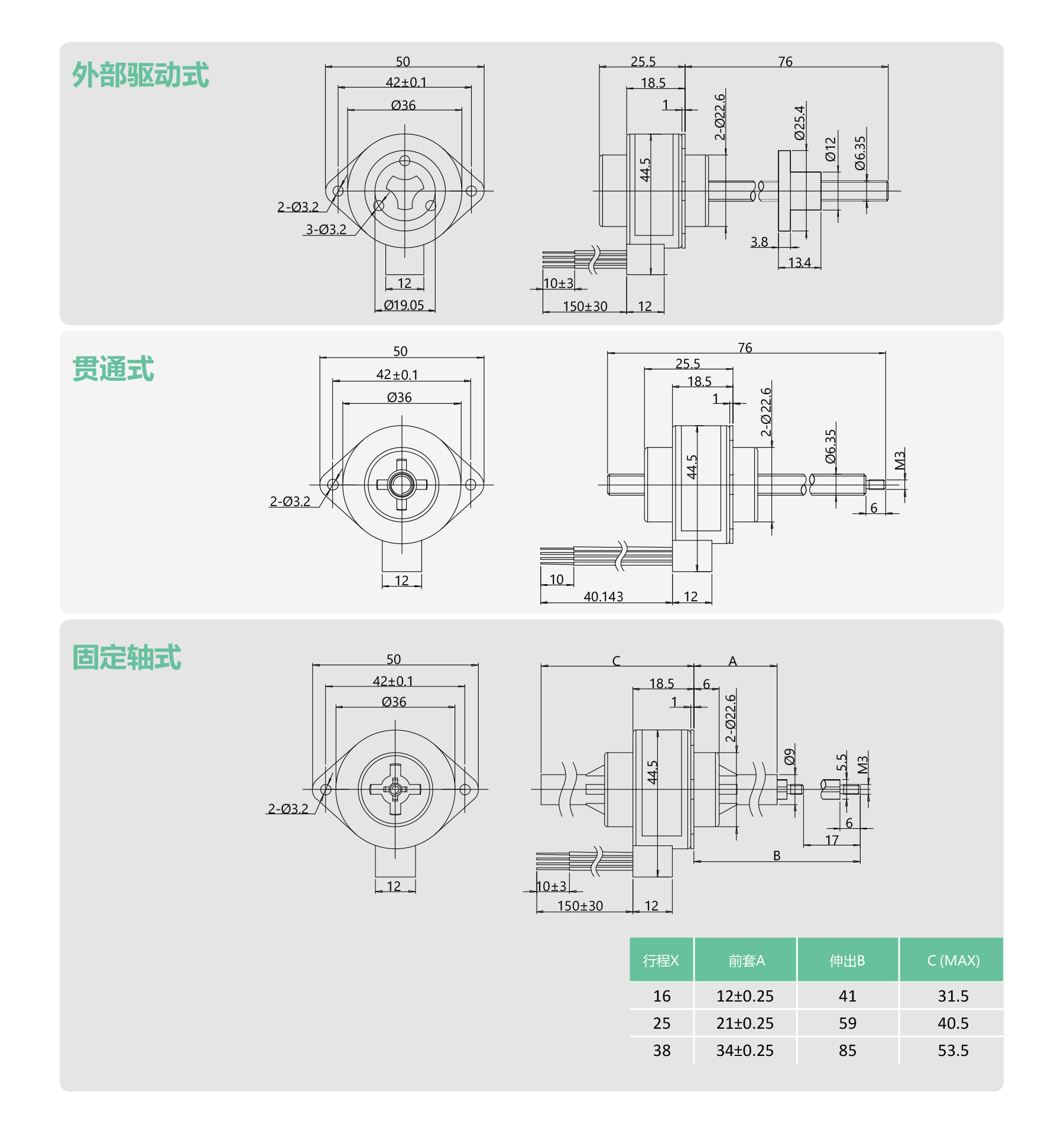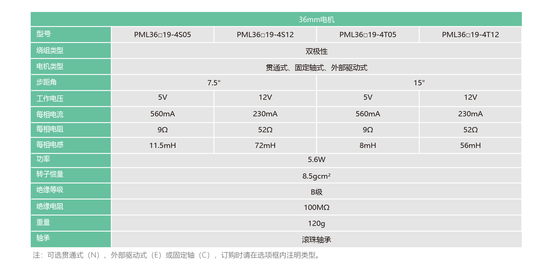 PML36 Series 36 mm bipolar permanent magnet stepper linear actuators, available in captive, non-captive and external types, offer 7.5° or 15° step angles with 5 V/560 mA or 12 V/230 mA windings. Featuring 8–72 mH inductance, 5.6 W power, 8.5 g·cm² rotor inertia, ball bearings, and 120 g weight, ideal for precise, robust linear motion.