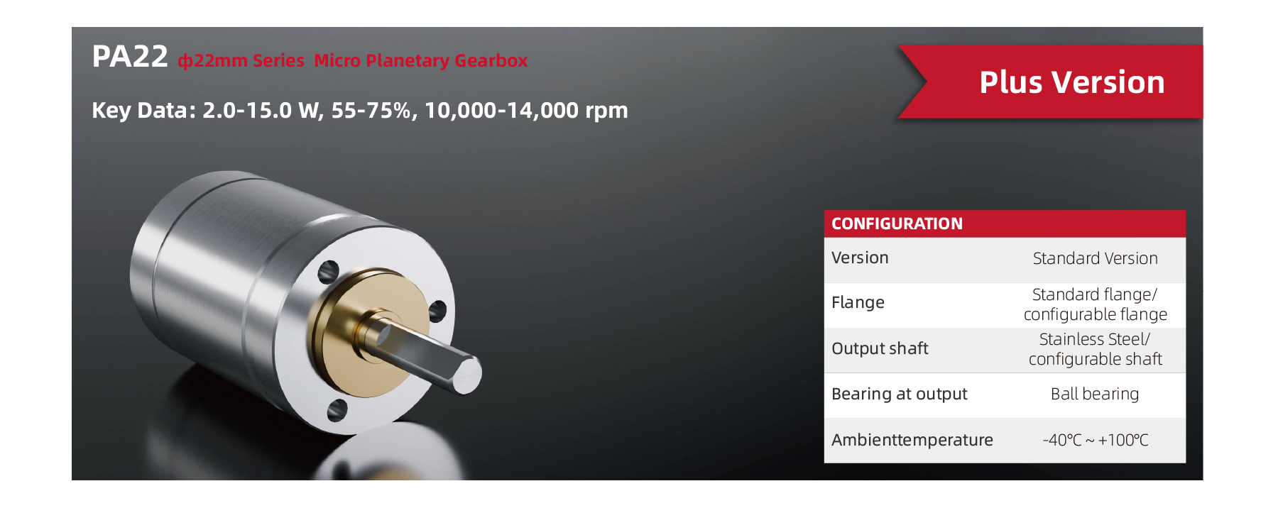 The PA22 22mm Series Micro Planetary Gearbox Plus Version offers continuous power from 2.0 to 15.0W with efficiencies ranging between 55% and 75%, operating at speeds of 10,000 to 14,000 rpm. It features stainless steel output shafts, configurable flanges, and ball bearings for reliable performance. The gearbox supports continuous torque up to 2.00 Nm and intermittent torque up to 2.50 Nm. It handles dynamic axial loads of 40N and radial loads up to 120N (5mm from flange). Compact in size, its length ranges from 31.8 to 45.0 mm, weighing between 51 and 63 grams, suitable for precise, high-performance applications.