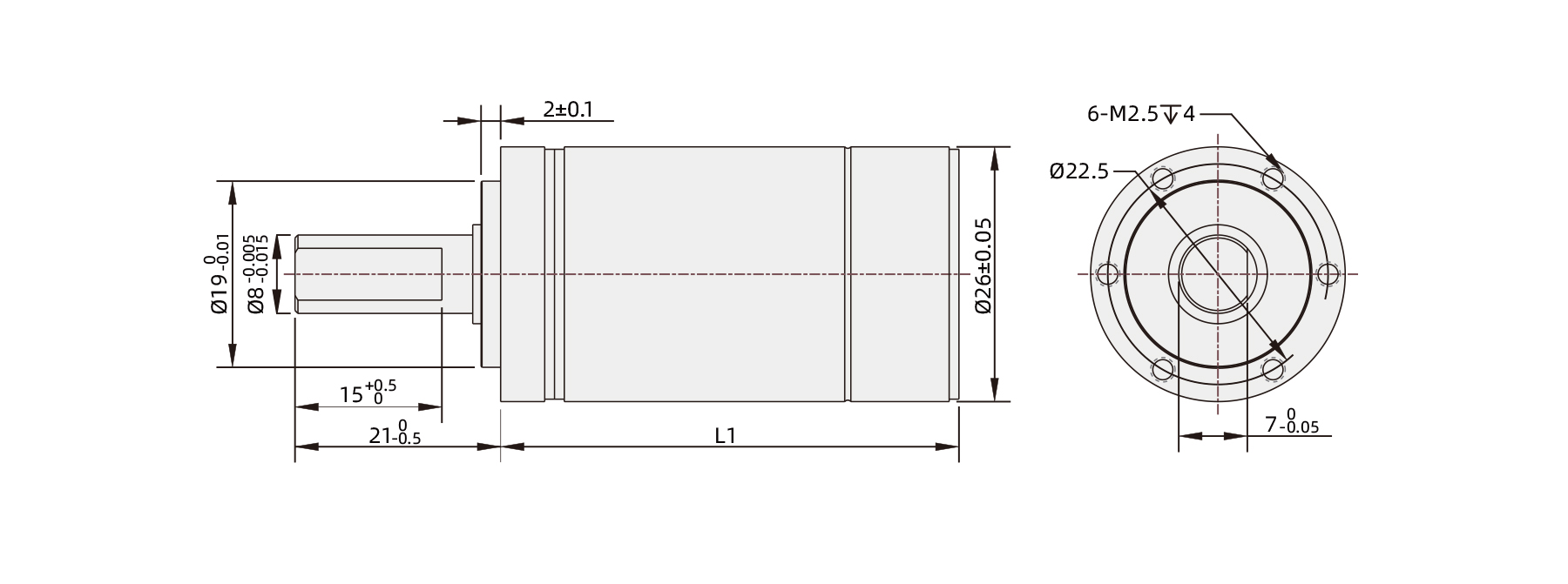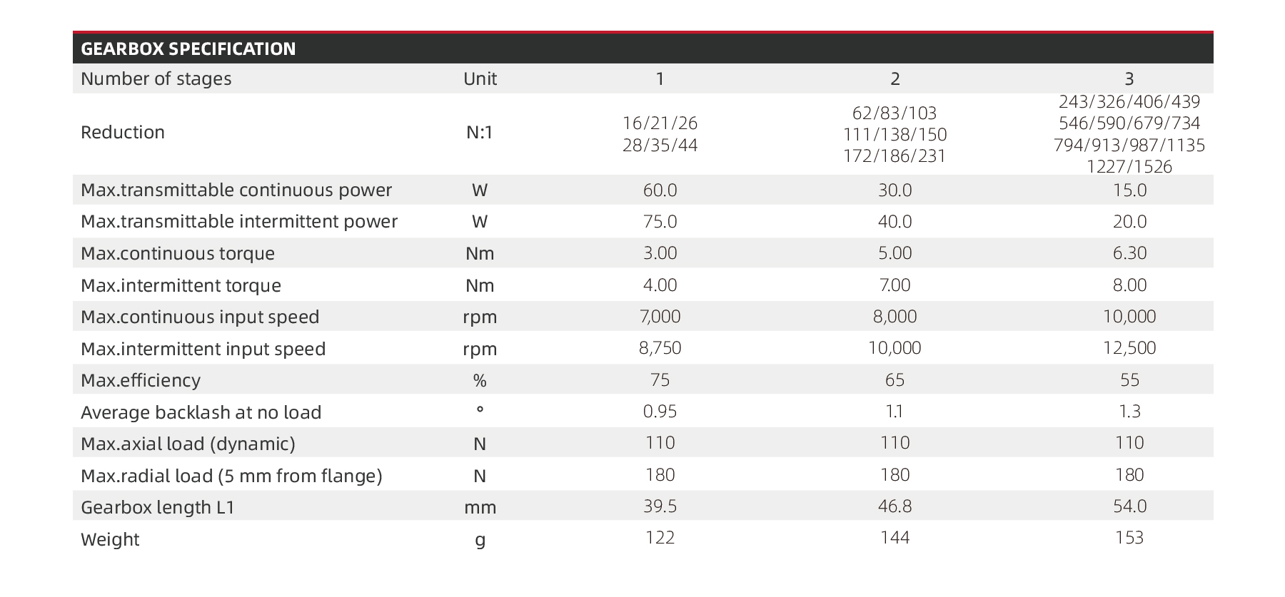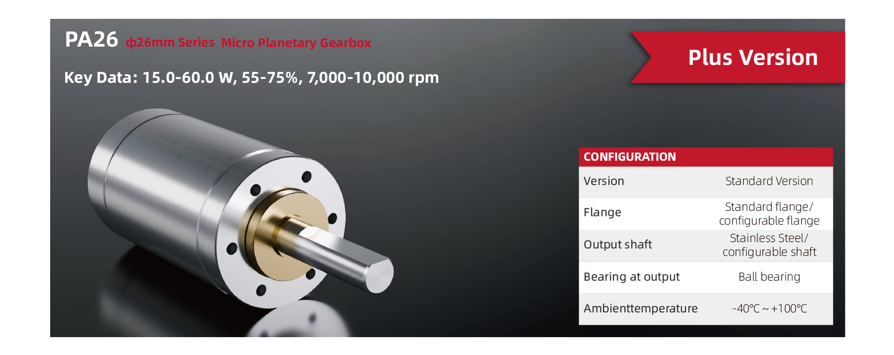 The PA26 26mm Series Micro Planetary Gearbox Plus Version delivers continuous power from 15.0 to 60.0W with efficiency between 55% and 75%, operating at speeds from 7,000 to 10,000 rpm. It features a stainless steel output shaft, configurable flanges, and durable ball bearings. The gearbox supports continuous torque up to 6.30 Nm and intermittent torque up to 7.00 Nm. It handles dynamic axial loads up to 110N and radial loads up to 180N at 5mm from the flange. Compact in design, its length ranges from 39.5 to 54.0 mm, weighing between 122 and 153 grams, suitable for high-precision industrial applications.