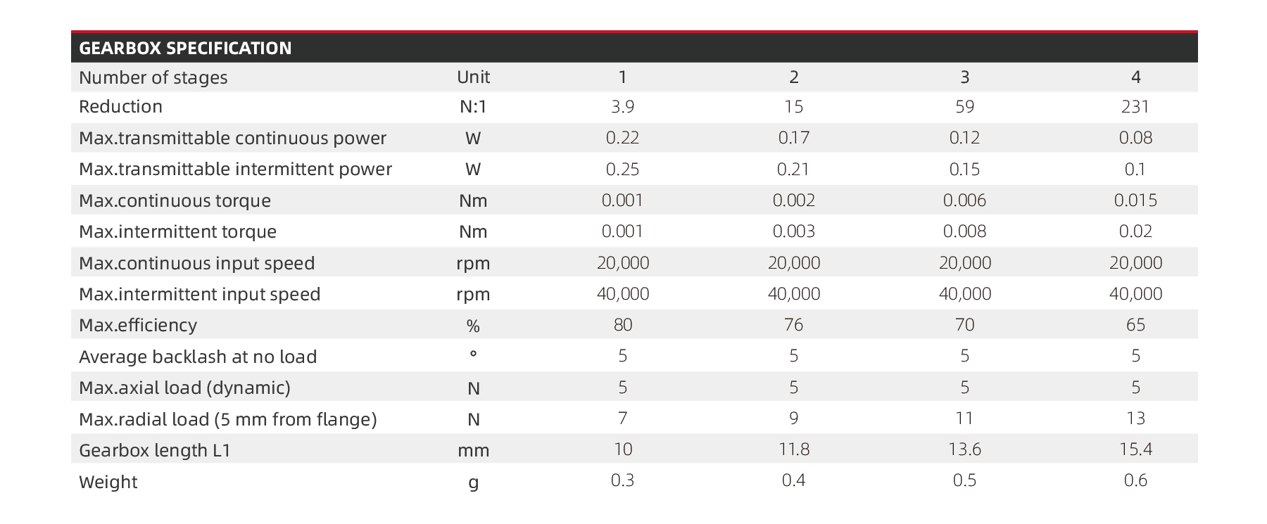 The PG04 4mm Micro Planetary Gearbox offers 3.9:1 to 231:1 ratios in 1–4 stages, delivering up to 0.02 Nm torque with 65–80% efficiency. Its stainless-steel shaft, ball bearing, and slotless coreless motor compatibility ensure precision, durability, and smooth performance in compact applications.