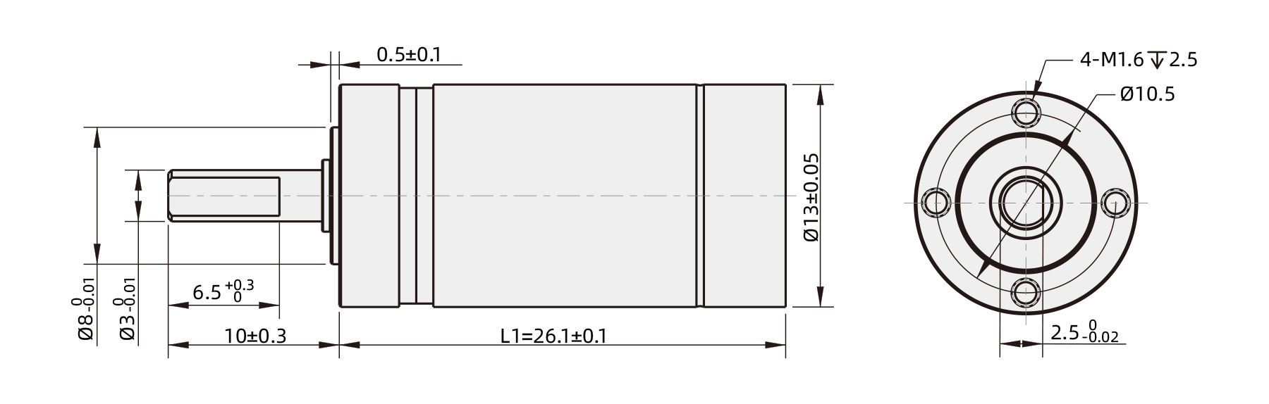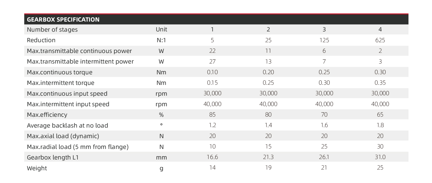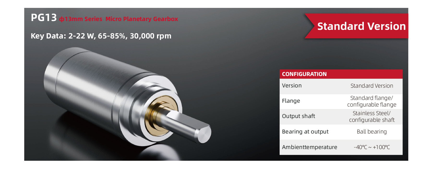 The PG13 13mm Micro Planetary Gearbox offers reduction ratios from 5:1 up to 625:1 across 1 to 4 stages. It delivers continuous torque up to 0.25 Nm with efficiencies reaching 85%, supporting input speeds up to 30,000 rpm and intermittent speeds up to 40,000 rpm. Featuring a stainless steel output shaft, ball bearing, and rated for operation between -40 °C and +100 °C, this gearbox provides a compact, reliable solution for precision motion control.