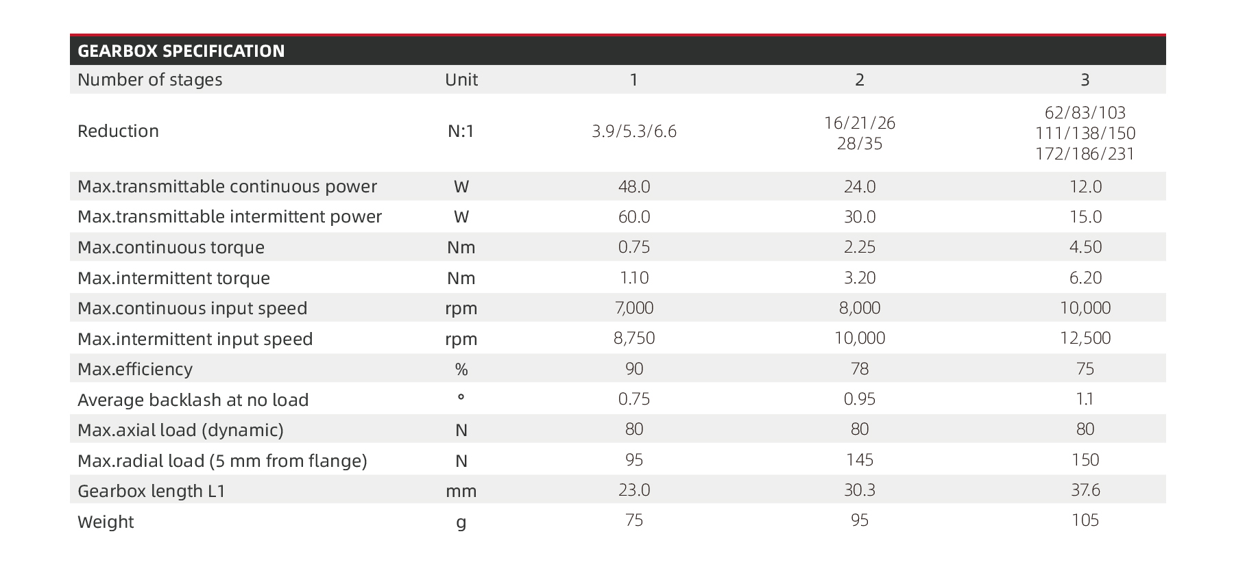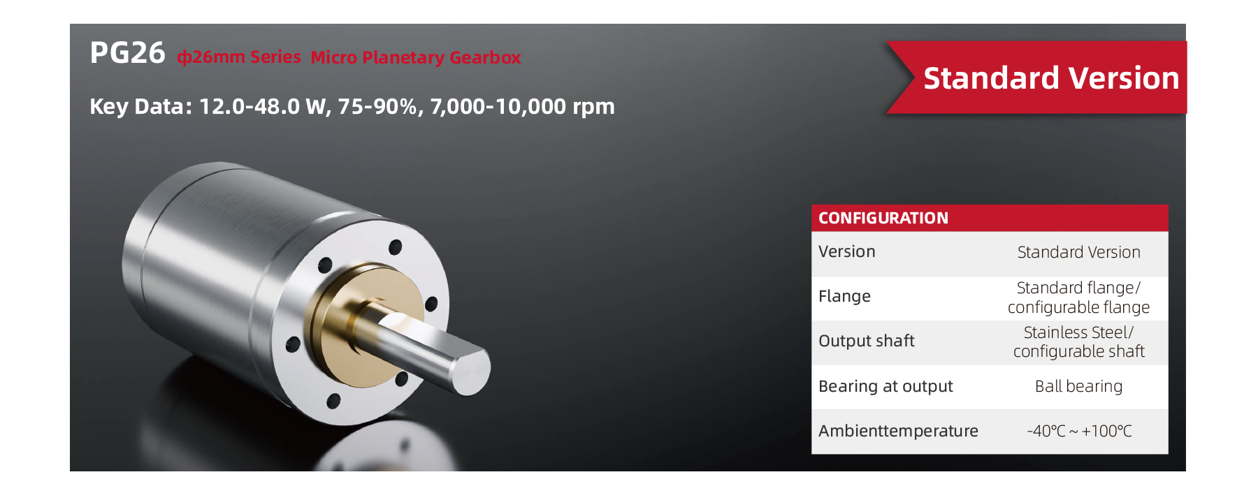 The PG26 series micro planetary gearbox features a 6mm shaft diameter with a standard design, offering continuous power from 12.0 to 48.0W and efficiency between 75% and 90%. It operates at input speeds of 7,000 to 10,000 rpm. The gearbox provides multiple reduction ratios and delivers maximum continuous torque up to 4.50 Nm and intermittent torque up to 6.20 Nm. It supports dynamic axial loads up to 80 N and radial loads up to 150 N, with a compact length of 75 to 105 mm, suitable for precise and demanding applications.