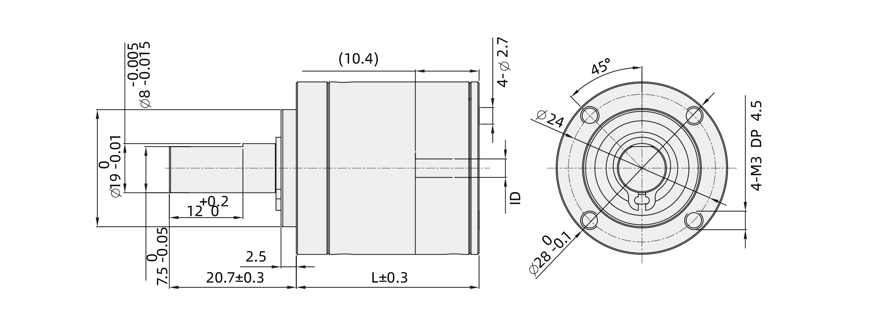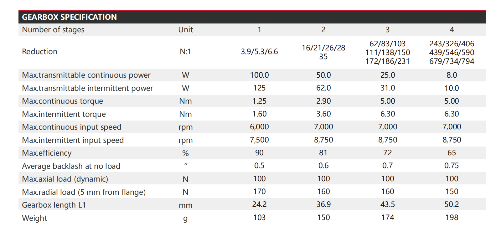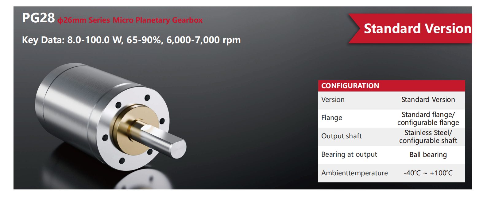 The PG28 series micro planetary gearbox features a 8mm shaft diameter with a standard design, delivering continuous power ranging from 8.0W to 100.0W and efficiency between 65% and 90%. It operates at input speeds of 6,000 to 7,000 rpm. With multiple reduction ratios, the gearbox provides continuous torque up to 5 Nm and intermittent torque up to 6.3 Nm. It supports dynamic axial loads up to 100 N and radial loads up to 170 N. Compact and robust, its length ranges from 24.2 to 50.2 mm, ideal for heavy-duty precision applications.